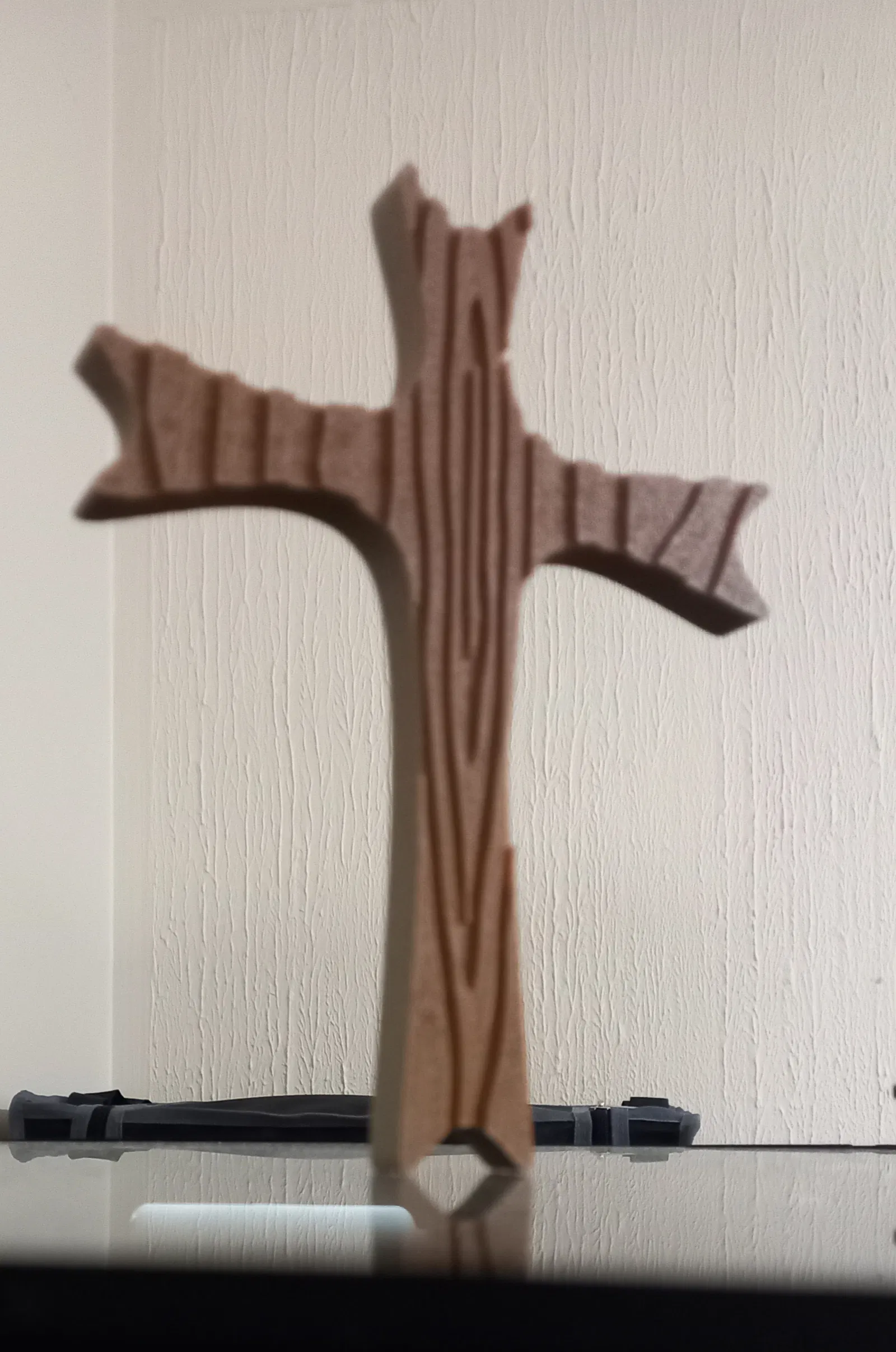 Mẫu thánh giá được thiết kế với bề mặt có kết cấu sần sùi độc đáo. Bạn có thể sử dụng nhựa in PLA+ và tùy chỉnh các thông số như fuzzy skin hay Octagram Spiral trong slicer để tạo hiệu ứng đẹp mắt như hình minh họa.