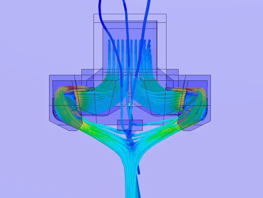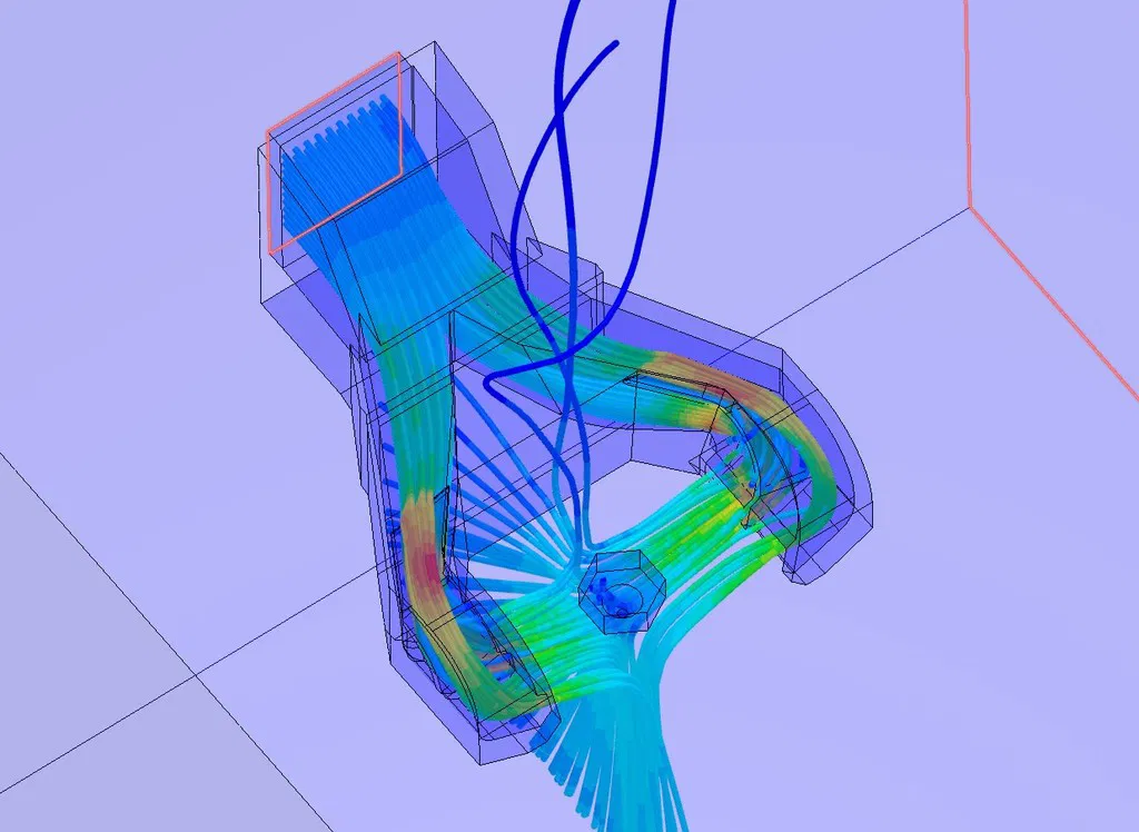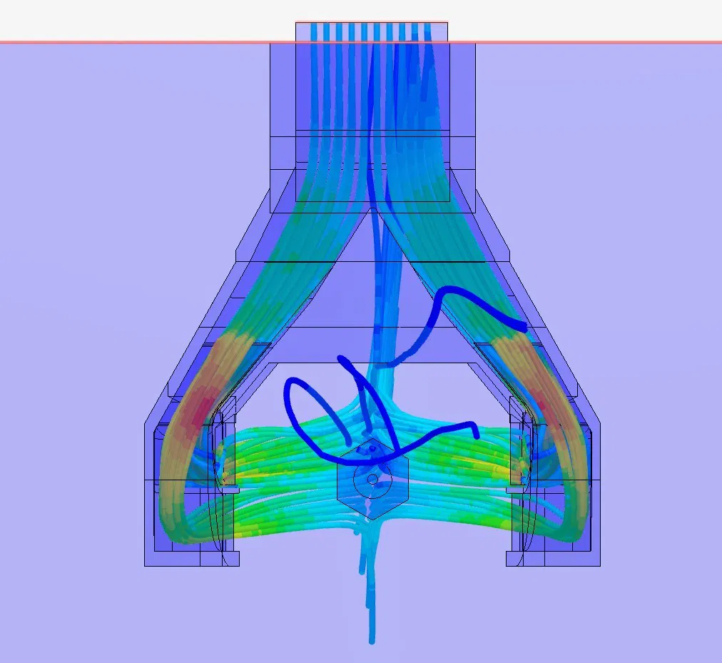 Kết quả in thử nghiệm cho thấy sự cải thiện rõ rệt. Cả thử nghiệm bằng tia nước và mô phỏng 32 Sim Scale CFD đều cho thấy luồng khí thổi đúng vào vị trí ngay dưới tâm của nozzle. Đây là dấu hiệu cho thấy khả năng làm mát vật thể tốt, tránh làm mát nhầm vào nozzle hoặc heater block.
