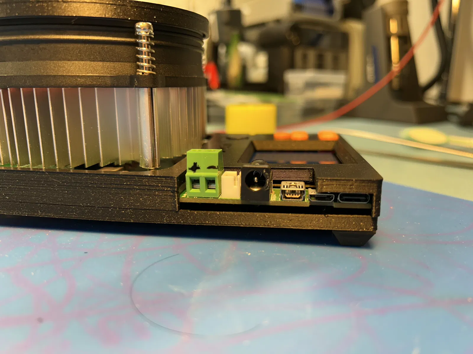 Điểm nhấn đáng chú ý nhất của bản thiết kế này chính là phần nắp trên được tích hợp sẵn các khe cắm kết nối nhúng và đi kèm một tấm chắn quạt tản nhiệt (fan grill) được in 3D tinh xảo. Tấm chắn quạt này được thiết kế theo dạng khớp nối ma sát (friction fit), giúp bạn dễ dàng lắp đặt mà không cần thêm keo hay ốc vít phức tạp. Nó không chỉ bảo vệ các cánh quạt tản nhiệt khỏi va chạm ngoài ý muốn trong quá trình vận hành mà còn giữ cho luồng khí luôn ổn định, giúp tản nhiệt hiệu quả hơn cho thiết bị khi hoạt động dưới tải cao.