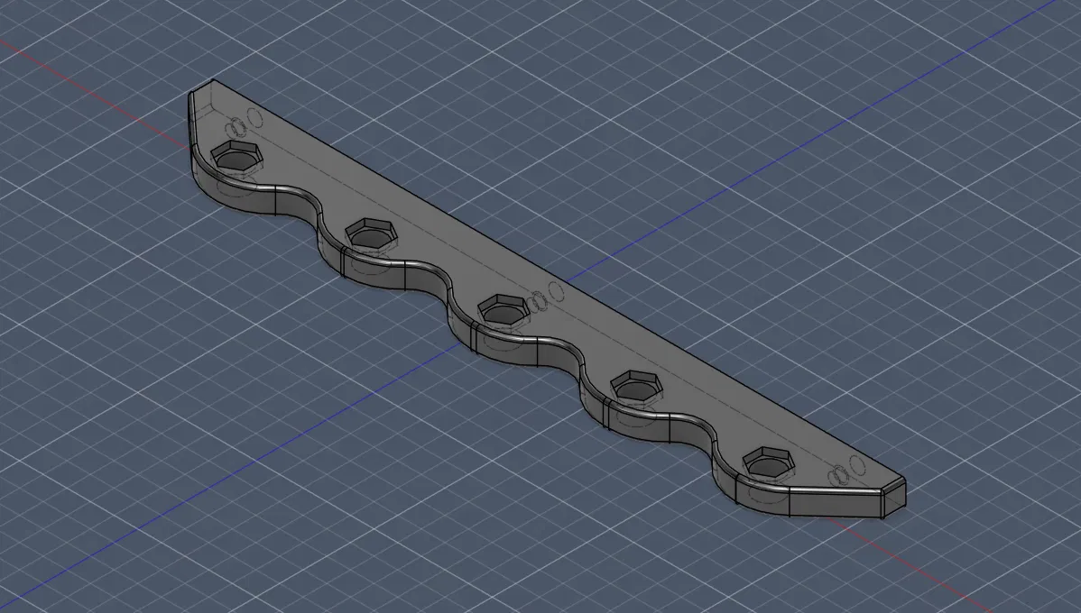 Mình tạo ra cái này để bắt vít vào mặt trước của kệ, nhằm gắn các ống dẫn nhựa cho máy in MMU3. Các lỗ xuyên qua có đường kính 12mm với hốc lục giác 14mm để lắp vừa đầu nối khí nén (push-to-connect) 4mm. Các lỗ để nhét ren cấy (threaded inserts) có đường kính 6,4mm và sâu 7mm, phần đáy mở rộng xuống 10mm với đường kính 5mm. Mình đã dùng loại ren cấy nhấn cho ốc vít 10-24 có đường kính ngoài (OD) là 6,9mm tại phần khía nhám.