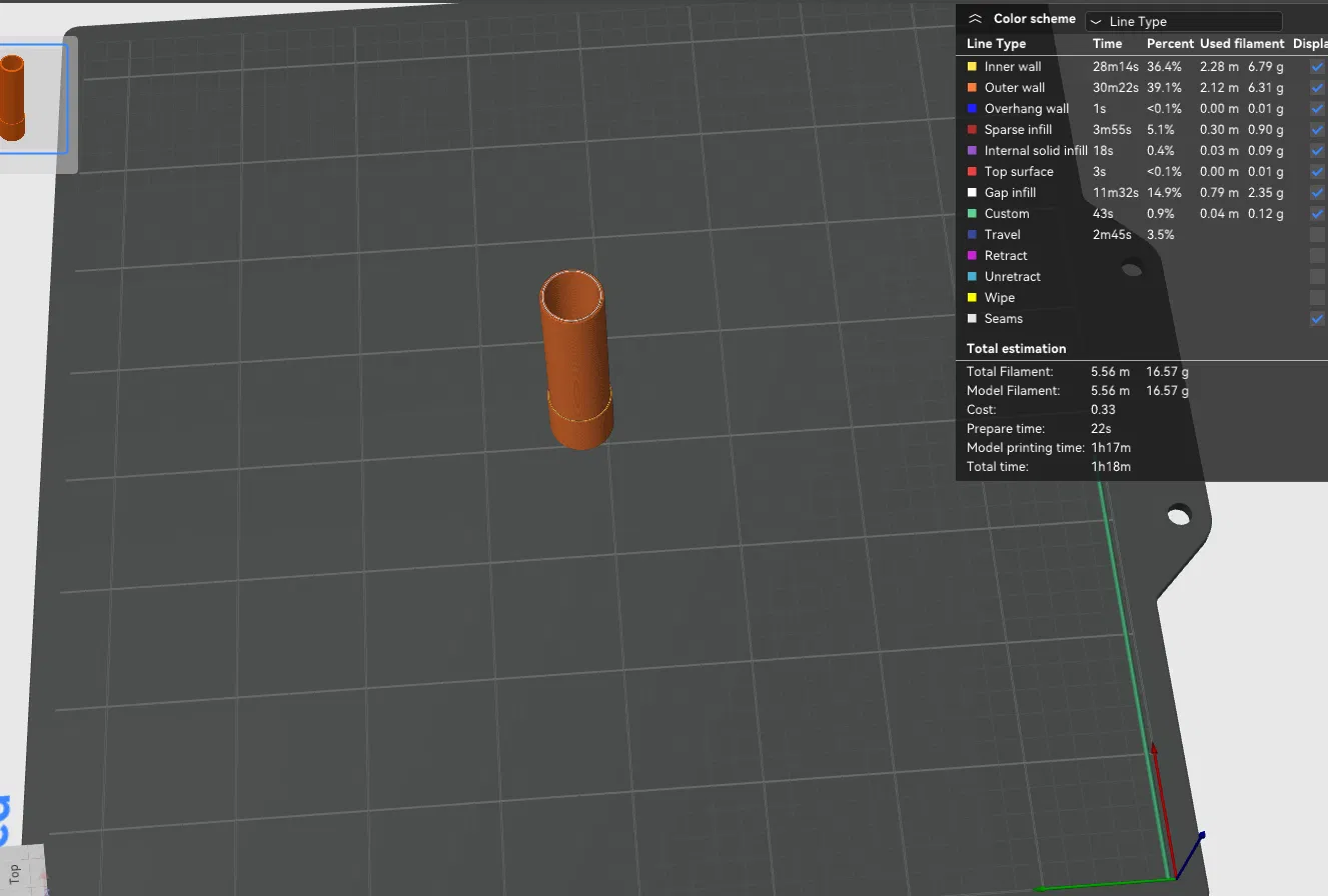 - Thời gian in: Dựa trên mô phỏng, thời gian in ước tính chỉ khoảng 1 giờ 18 phút, rất nhanh chóng và thuận tiện cho việc thử nghiệm các phiên bản khác nhau.