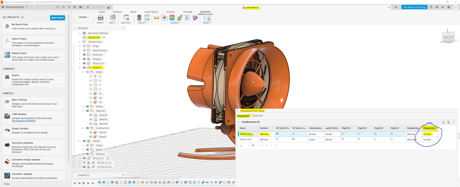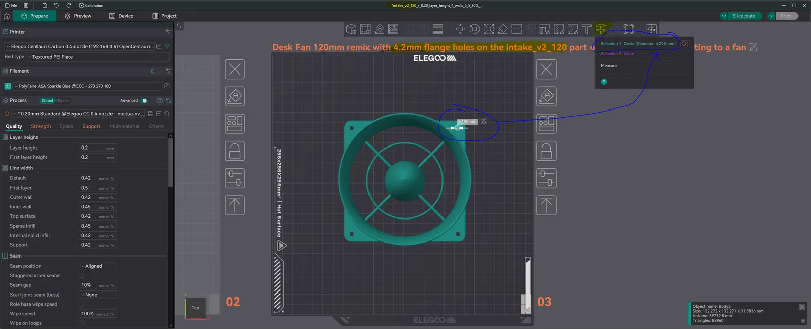 Đây là linh kiện "intake_v2_120" gốc nằm trong mẫu "120mm/140mm Desk Fan (Updated)". Chỉ riêng phần 120mm “Intake” của mẫu gốc đã được chỉnh sửa (trong Fusion, sử dụng cài đặt “Configuration Parameters”, xem hình đầu tiên để biết chi tiết) với duy nhất một thay đổi: tích hợp 4 lỗ bắt vít M4 4.2mm (được thiết kế với dung sai chặt) để gắn vào quạt, thay vì lỗ M3 3.2mm mặc định như mẫu gốc. Đây là thay đổi duy nhất so với bản gốc. Nếu bạn cần sử dụng bộ phận "intake_v2_120" với ốc M4 4.2mm, thì bản remixed này rất tiện lợi vì bạn không cần phải khoan mở rộng lỗ hay tìm cách chỉnh sửa tệp tin. Tôi đã đính kèm các tệp .3mf, .stl, step và tệp Autodesk Fusion .f3z gốc (bạn có thể dễ dàng thay đổi “Configuration Parameters” nếu cần, nhưng chỉ khi có bản quyền hoặc dùng thử 30 ngày) trong phần tệp tin. Lưu ý: Trong mẫu gốc, phần "intake_v2_140" 140mm đã có sẵn lỗ 4.2mm, nhưng không hiểu sao phần "intake_v2_120" 120mm lại chỉ có lỗ 3.2mm. Bản remixed này đã khắc phục sự khác biệt đó bằng cách đồng bộ kích thước lỗ 4.2mm cho phiên bản 120mm.