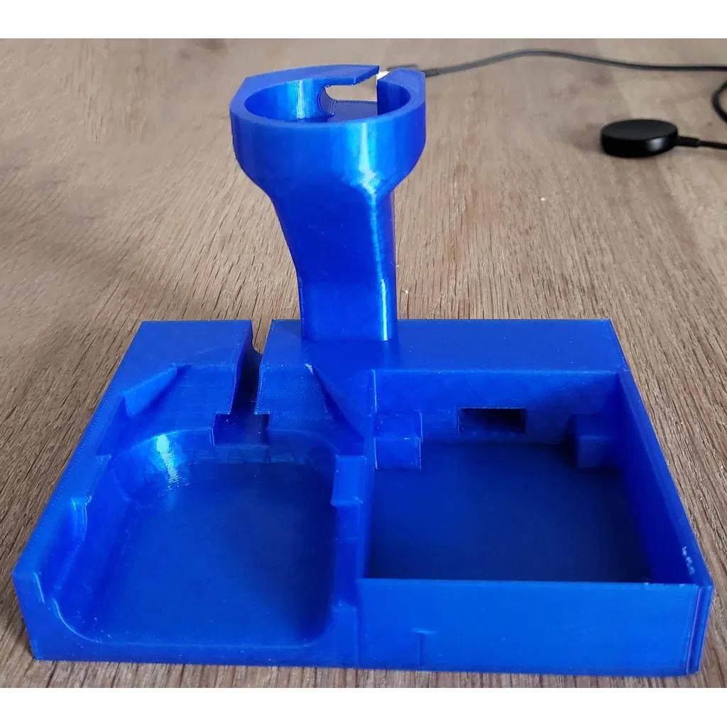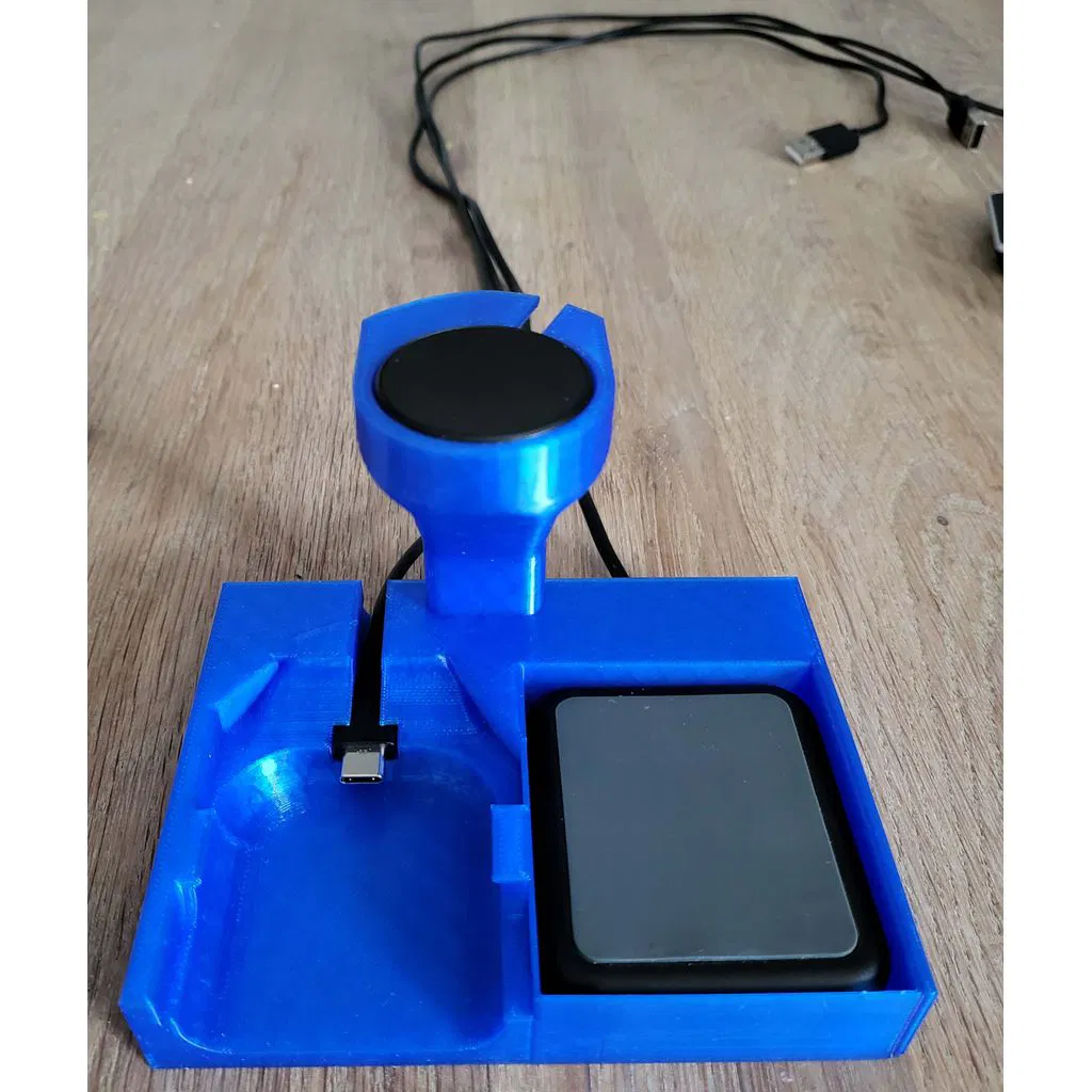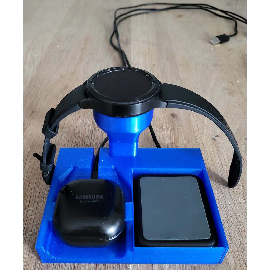 Đây là đế sạc dành cho Galaxy Buds Pro, Samsung Galaxy Watch 4 (classic) và một bộ sạc QI cho điện thoại. Mình đã thiết kế riêng đế này cho bộ sạc Crave Qi vì đây là loại nhỏ gọn nhất mà mình có.