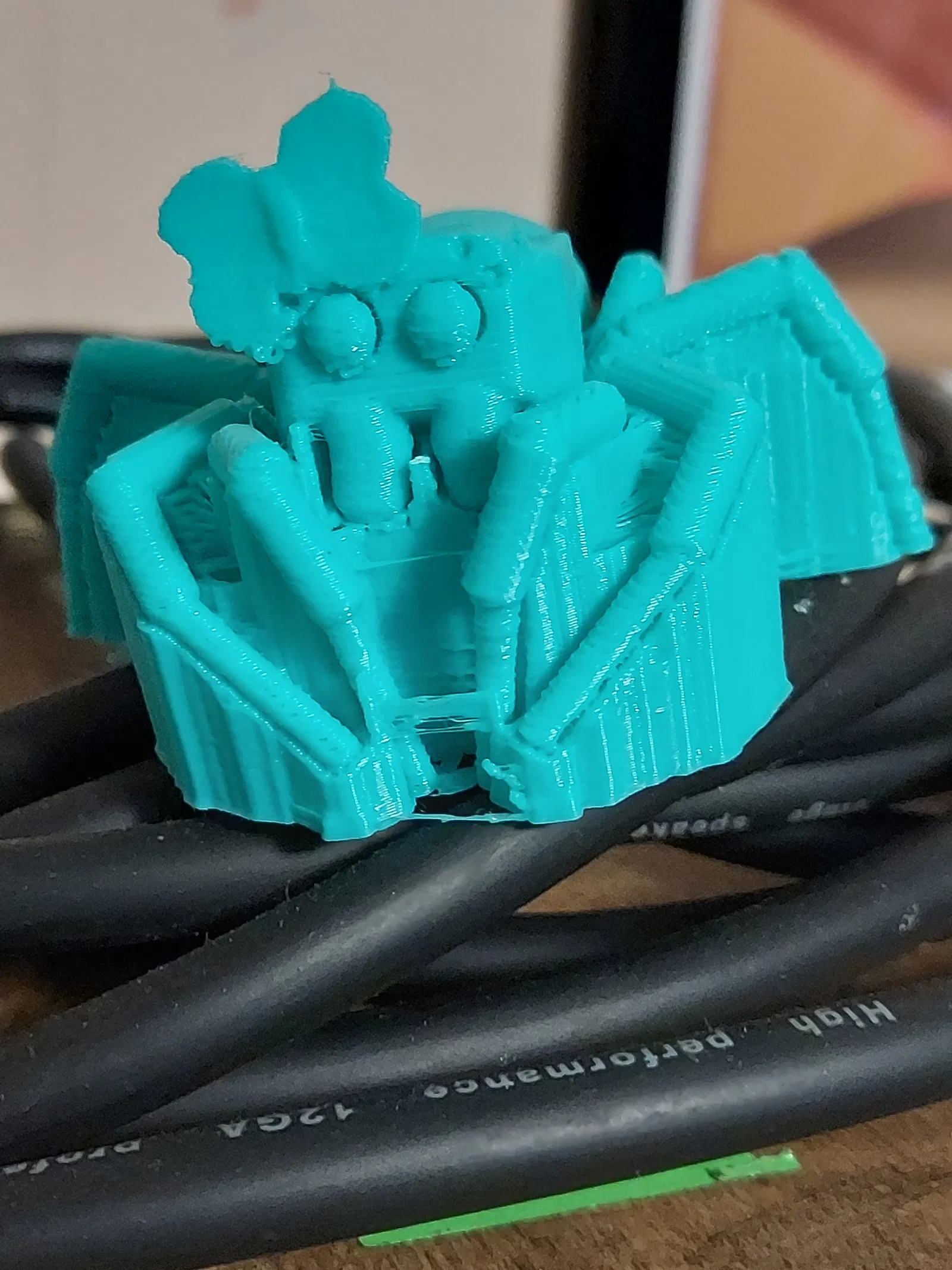 In ấn trực tiếp (print-in-place) và sử dụng support. Bạn nên tăng khoảng cách giữa support và mô hình (z spacing) để dễ gỡ hơn. Phần chân là bộ phận yếu nhất của mô hình này. Một cách khác là in ngược chú nhện lại để giảm áp lực lên phần chân. Mình dùng nhựa PLA trên máy in QIDI Tech I-Mate S, các dòng máy đời mới hơn chắc chắn sẽ cho kết quả tốt hơn nhiều.