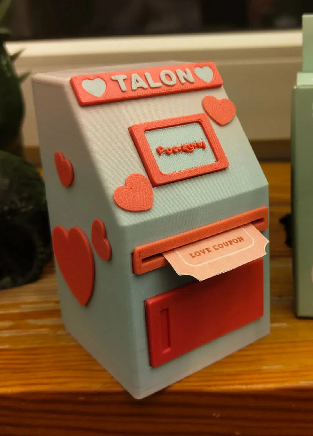 Mô hình máy bán vé tình yêu cực kỳ thú vị và độc đáo cho dịp Valentine. Tác giả đã lấy cảm hứng từ ý tưởng quà tặng DIY trên Pinterest để tạo ra phiên bản in 3D này. Bạn cần hệ thống in đa màu để tạo ra thành phẩm đẹp mắt nhất.