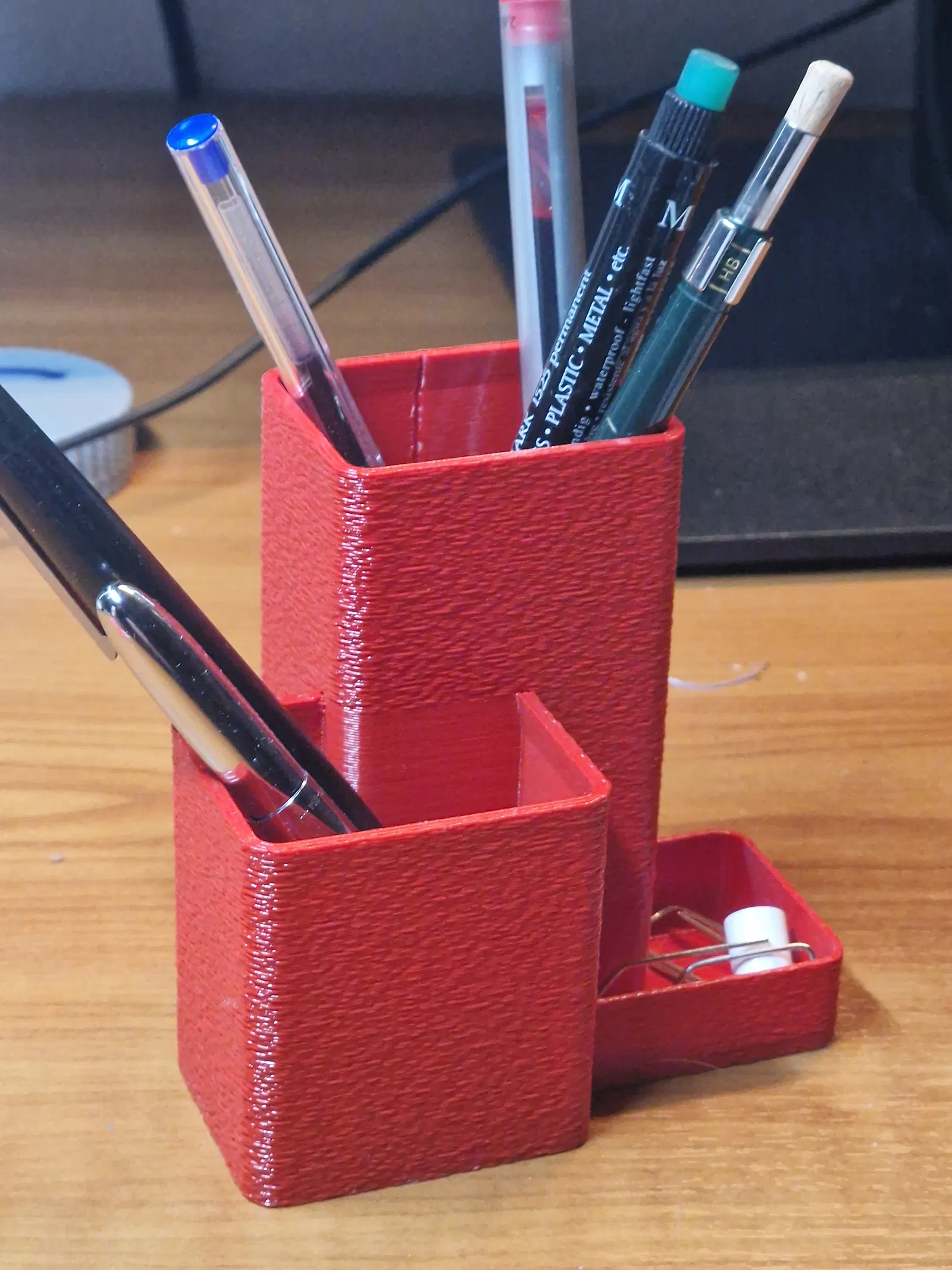 Thiết kế của khay bao gồm các ngăn có độ cao và kích thước khác nhau, giúp bạn dễ dàng phân loại đồ đạc. Bạn có thể tận dụng ngăn cao để cắm bút, thước kẻ hoặc các loại bút đánh dấu. Ngăn thấp hơn rất thích hợp cho các loại bút chì hoặc vật dụng cá nhân cần lấy nhanh. Ngoài ra, phần khay nhỏ bên cạnh còn là nơi hoàn hảo để đựng ghim giấy, kẹp bướm, tẩy hoặc những món phụ kiện nhỏ xíu hay bị thất lạc. Chỉ cần in một lần, bạn đã có ngay một góc làm việc chỉn chu, ngăn nắp hơn rất nhiều.