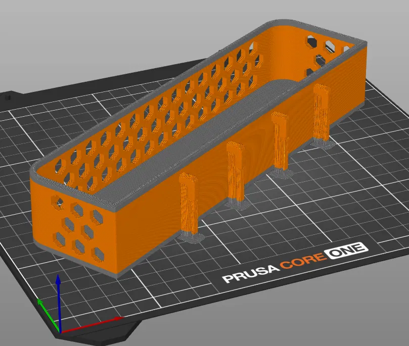 Chiếc hộp này được thiết kế riêng để lắp vừa vặn vào phần đáy của bản Prusa CORE One SKADIS mod. Bạn nên xoay mô hình 30 độ và chỉnh Fill-Angle trong PrusaSlicer cùng góc để đạt kết quả in tối ưu nhất.