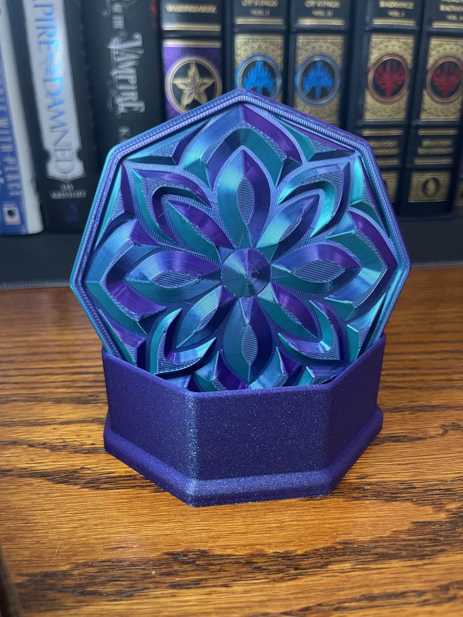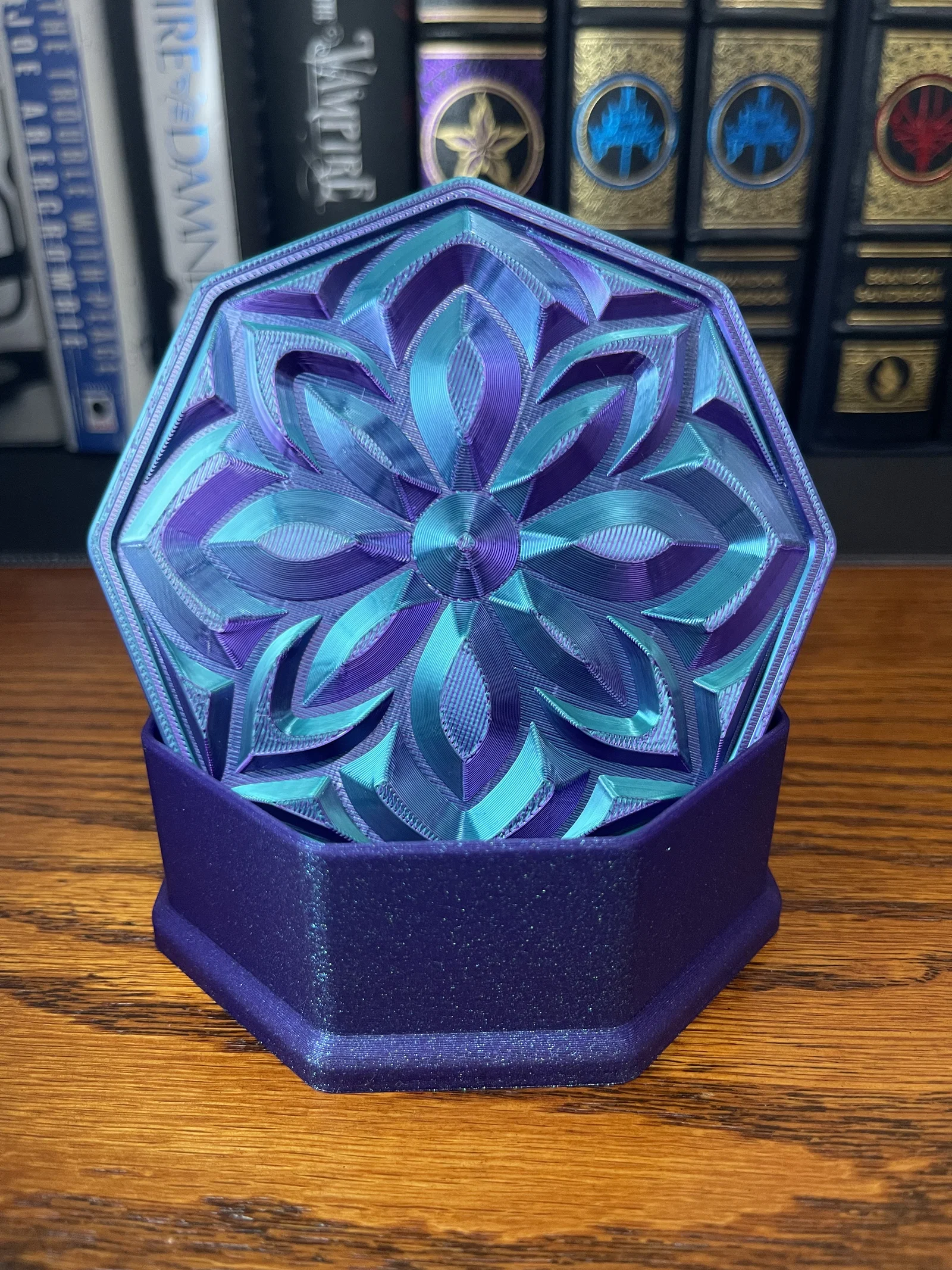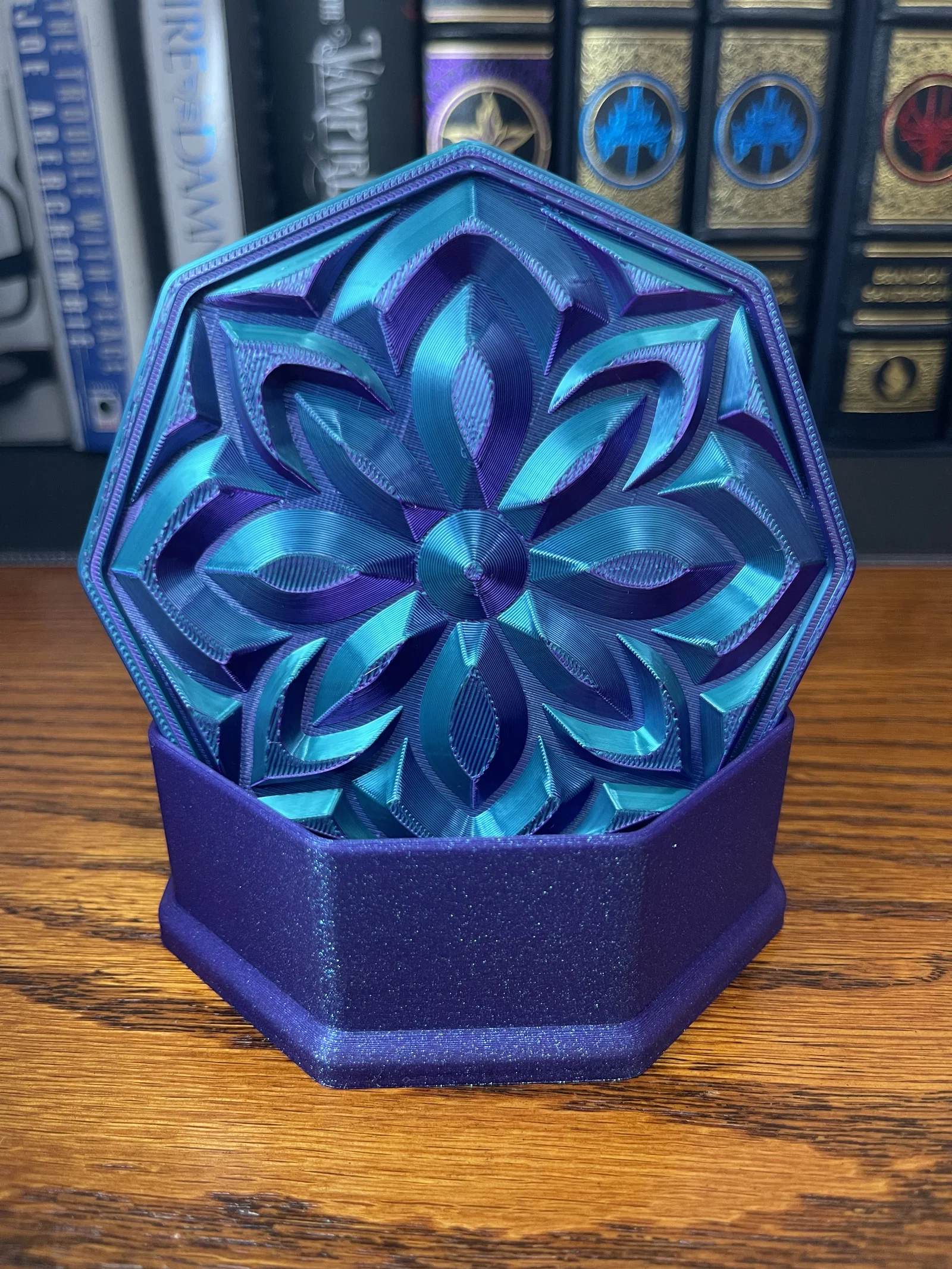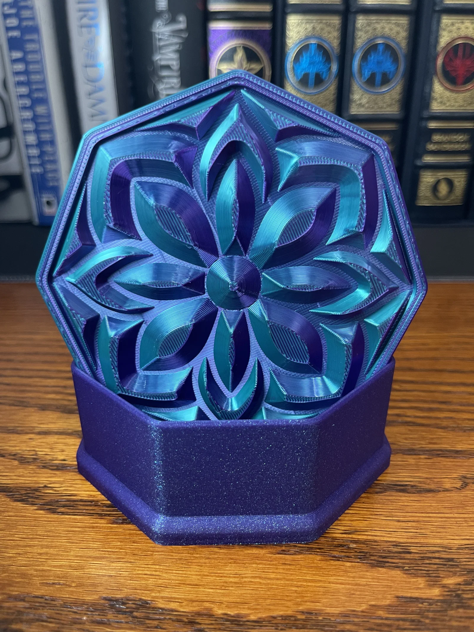 ✔ Nắp Mandala Sang Trọng – Họa tiết hoa lấy cảm hứng từ đá quý bắt sáng cực kỳ đẹp mắt ✔ Hình Dáng Bát Giác – Một biến tấu độc đáo so với các mẫu hộp đựng truyền thống ✔ Thiết Kế Không Cần Support – Dễ dàng in ấn mà không cần dùng đến cấu trúc hỗ trợ ✔ Vừa Tiện Dụng Vừa Decor – Hoàn hảo để đặt trên bàn làm việc, bàn trang điểm, kệ sách hoặc làm quà tặng ✔ Cực hợp với Silk PLA nhiều màu! – Đặc biệt lộng lẫy khi in bằng silk PLA, đặc biệt là các loại nhựa đổi màu kép hoặc ba màu, giúp tạo ra hiệu ứng chuyển màu rực rỡ và chiều sâu sống động cho thiết kế như đá quý này.