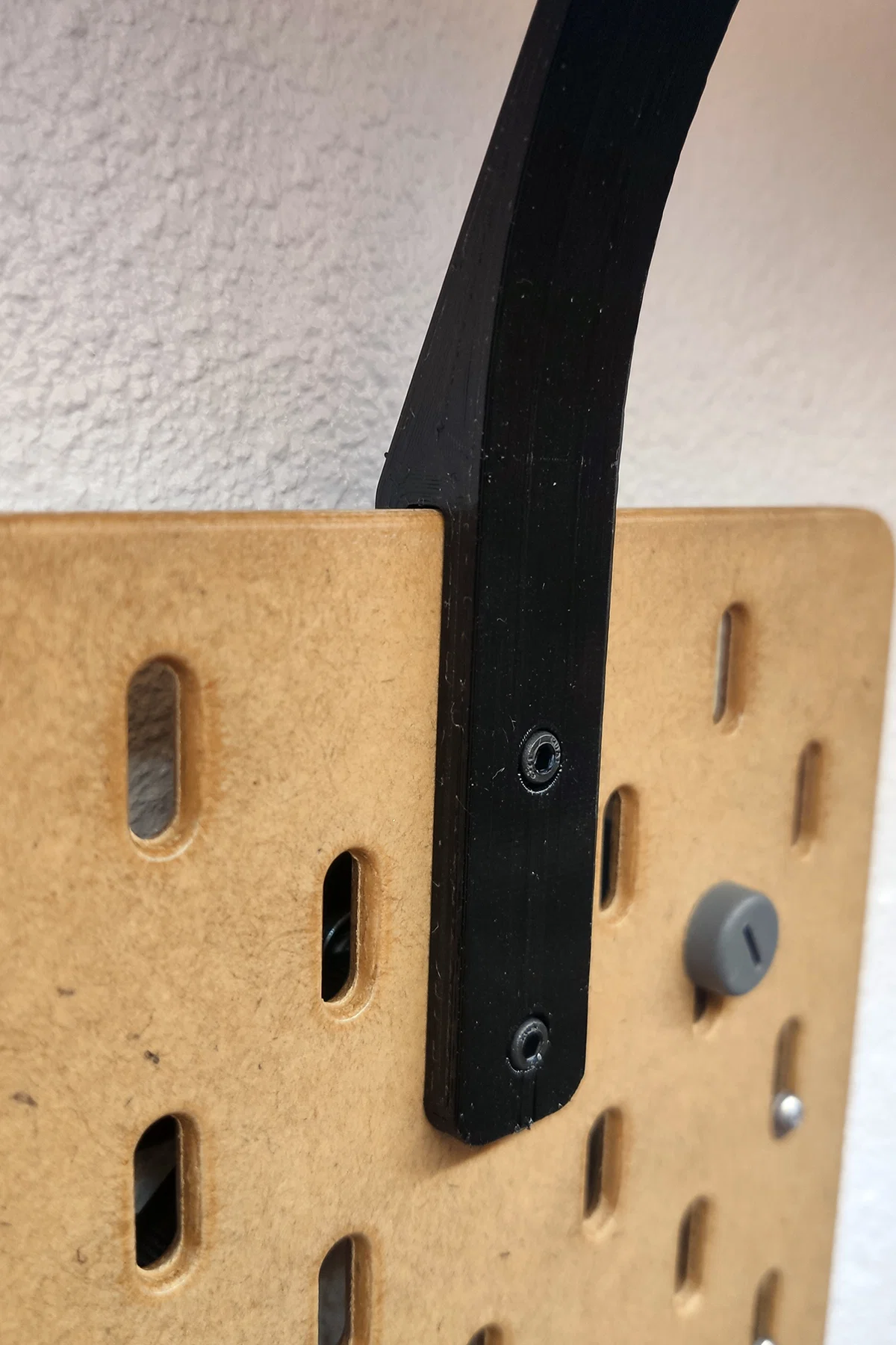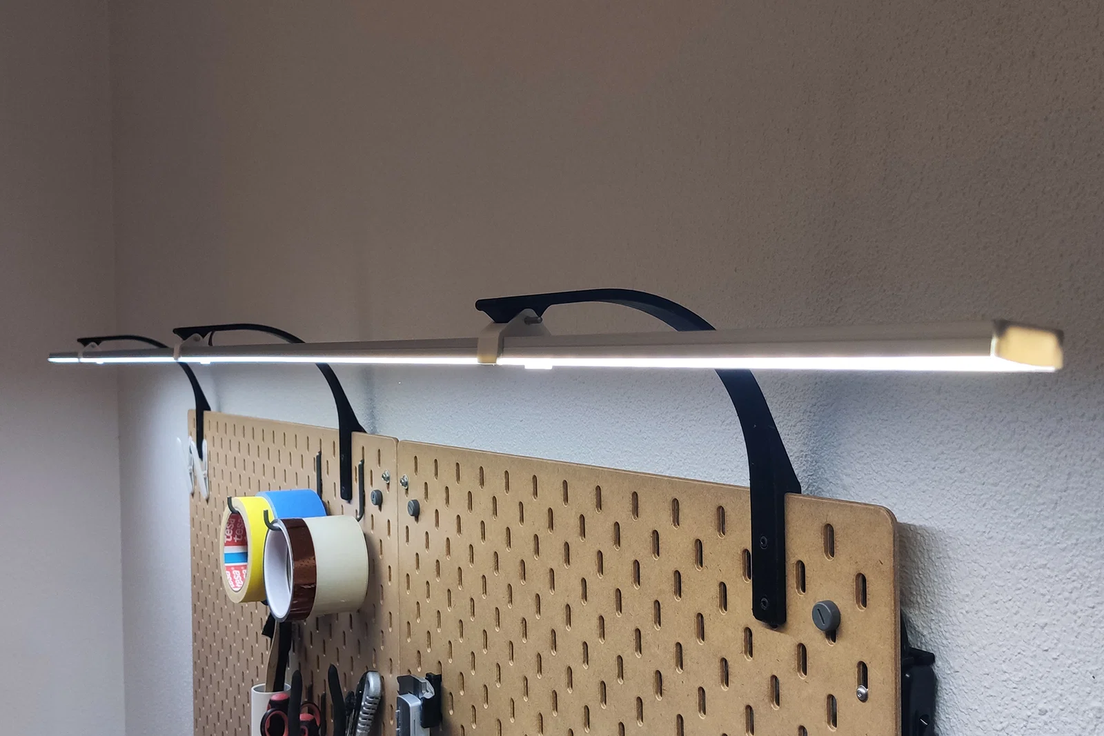 Một thiết kế đơn giản để gắn thanh đèn LED phía trên bảng pegboard SKADIS. Giá đỡ giúp đặt thanh đèn cách bảng khoảng 15 cm về phía trước và cao hơn 5 cm so với mặt trên của bảng.