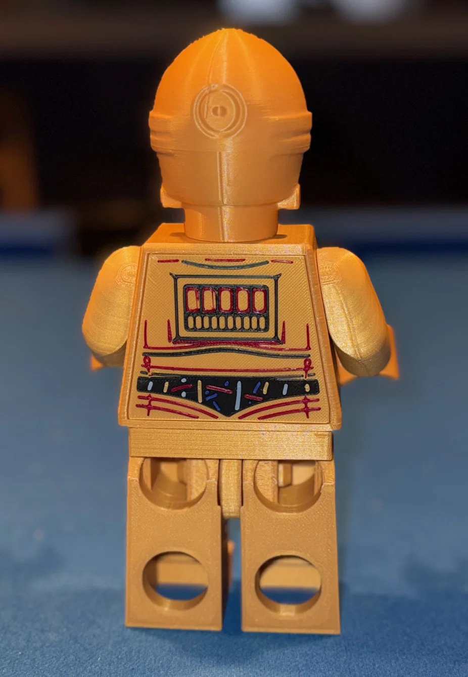 Đây là bộ các khối mảnh ghép giúp bạn dựng lại mô hình C-3PO với tỉ lệ phóng đại 500%. Nhân vật này xuất hiện lần đầu trong bộ Death Star ra mắt năm 2016 và đã có mặt trong 11 bộ khác từ năm 2016 đến 2021. Tất cả các file STL cần thiết đã được đính kèm trong thư mục "stl files" bên dưới. Nếu bạn đang dùng máy in Bambu, có sẵn file dự án trong thư mục "Bambu Projects" để mọi việc dễ dàng hơn. File này đã sắp xếp các linh kiện theo hướng in tối ưu, đồng thời tô màu sẵn cho các bộ phận cần thiết. Bạn sẽ cần BambuStudio để mở và thao tác với file này. Mô hình này được tùy chỉnh dựa trên thiết kế Brick MegaFigure của Julia Ebert. Những thay đổi chính bao gồm: Thu nhỏ tất cả các chi tiết 50% để phù hợp với tỉ lệ 5:1 so với các bản gốc mà chúng tôi từng chia sẻ. Phần thân và eo được thiết kế lại có khoang trống để dán sticker đi kèm (cần dùng keo để cố định). Phần eo được tinh chỉnh giúp lắp ráp dễ dàng hơn. Chân được sửa đổi với các họa tiết trang trí riêng cho mẫu này. Đã loại bỏ các chốt nối vì ở tỉ lệ 50% khá khó thao tác (vẫn dùng keo để dán các điểm kết nối). Bàn tay được sửa lại để in kèm chốt nối (cần hỗ trợ support nhưng không cần dán keo). Hướng dẫn lắp ráp cơ bản có thể xem tại bài đăng của Julia. Đây là một mô hình cực kỳ tuyệt vời, dễ in và dễ lắp. Chân thành cảm ơn Julia đã chia sẻ tác phẩm này! Các phụ kiện khác được lấy từ hồ sơ Printables của thall72 và phóng to lên 500%. Anh ấy có một thư viện khổng lồ các mảnh ghép brick, rất hữu ích nếu bạn muốn tùy biến thêm cho mô hình của mình. Nếu bạn in mẫu này, chúng mình rất mong được chiêm ngưỡng thành quả của bạn. Hãy đăng ảnh lên và đừng quên nhấn nút "like" cho thiết kế này nhé. Chúc mọi người in ấn vui vẻ!! Lưu ý: Tất cả mô hình của chúng tôi là sản phẩm do fan làm, chỉ dành cho mục đích sử dụng cá nhân. Chúng tôi không liên kết với bất kỳ thương hiệu chính thức nào và nghiêm cấm việc mua bán file kỹ thuật số hoặc các sản phẩm in ra từ file.