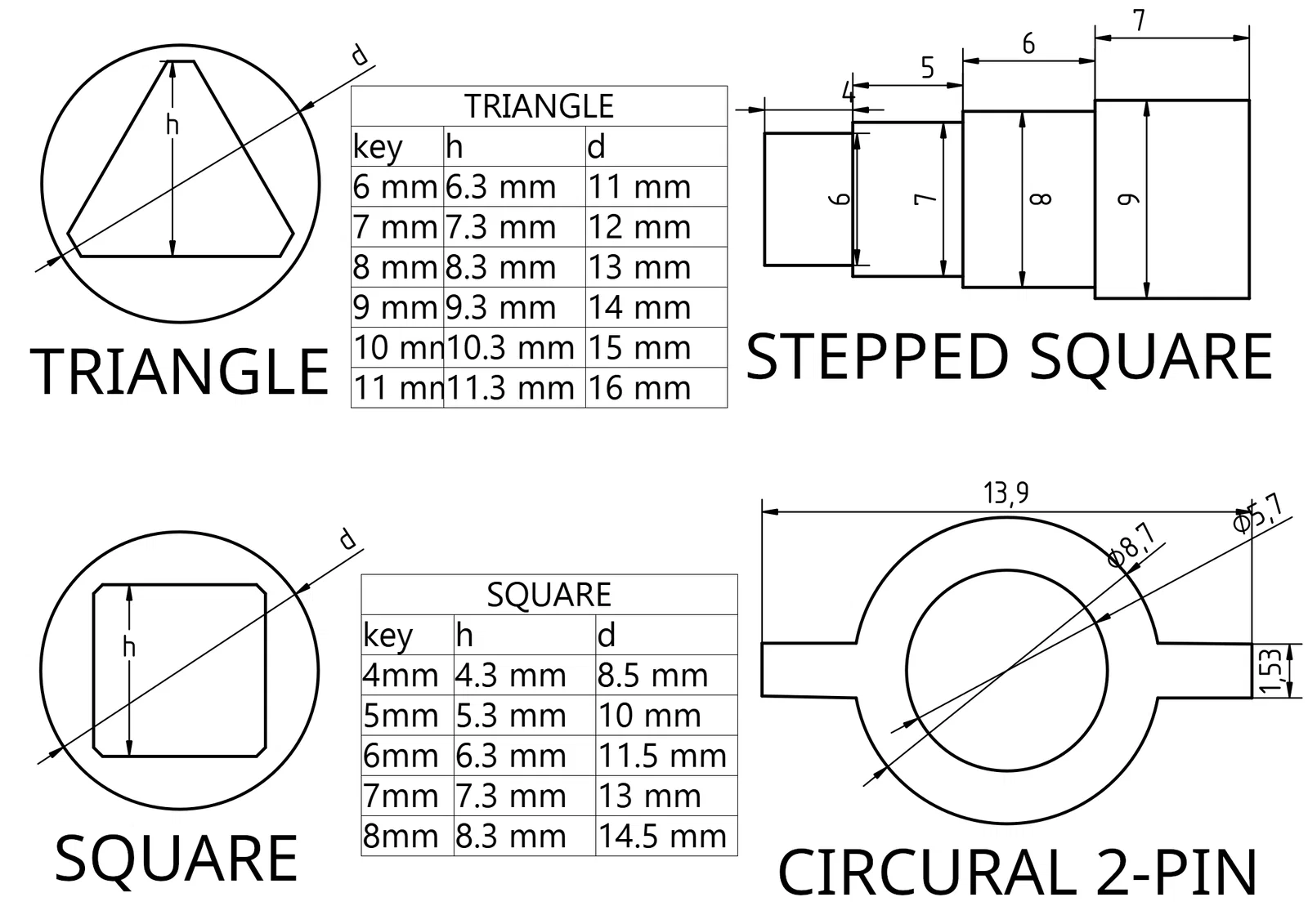 Tôi mới chuyển đến căn hộ mới và không may là chủ nhà không đưa chìa khóa van nước cho tôi. Tôi đã mượn tạm của hàng xóm, dùng thước kẹp đo đạc (hình tam giác 11mm) rồi bắt đầu tìm kiếm một chiếc chìa khóa phù hợp. Sau khi xem qua hàng chục danh mục sản phẩm từ các cửa hàng Ba Lan, AliExpress và Temu, tôi vẫn không tìm được loại nào đúng cả. Tôi thậm chí đã nghiên cứu về tiêu chuẩn hóa các loại chìa khóa này nhưng hóa ra chúng chẳng có tiêu chuẩn nào cụ thể... Vì thế, tôi quyết định tự thiết kế một bộ cho riêng mình. Các loại chìa tam giác và vuông được làm lớn hơn một chút — khoảng 0,1mm (tại điểm hẹp nhất) đến 0,3mm — nhằm bù trừ cho sai số của máy in mà vẫn đảm bảo chìa khóa không bị trượt khi sử dụng. Ngoài ra, mô hình còn bao gồm hai loại chìa phụ: chìa tròn 2 chấu và chìa vuông bậc thang — kích thước của chúng được hiển thị trong ảnh. Tôi cố gắng giữ đường kính tổng thể của các chìa khóa nhỏ nhất có thể (chìa nhỏ thì lọt vào lỗ lớn được, chứ ngược lại thì không), đồng thời đảm bảo đủ độ dày cho ít nhất hai đường nhựa đùn với nozzle 0,4mm để chìa không dễ bị gãy. Xin lưu ý rằng một số nhà sản xuất tạo ra các ổ khóa rất phi tiêu chuẩn — ví dụ như hình vuông 8,4mm — để giữ độc quyền cho chìa khóa của họ. Do đó, vui lòng đo kỹ ổ khóa của bạn, vì rất có thể các chìa khóa có sẵn ở đây sẽ không khớp hoàn hảo. Tôi cũng cung cấp file .blend bao gồm khuôn mẫu chìa khóa với điểm tâm (origin point) đã được căn chỉnh. Bạn chỉ cần thêm khối hộp hoặc trụ (3 cạnh) để tùy chỉnh chìa khóa của riêng mình. In bằng nozzle 0,4mm, layer height 0,12mm. Không khuyến khích dùng nozzle lớn hơn. Thường không cần dùng support — chiếc Ender 3 cũ của tôi chỉ hơi vất vả một chút với chìa tròn 2 chấu.