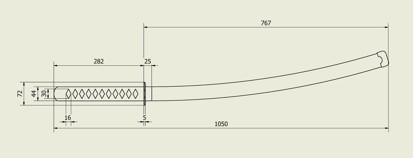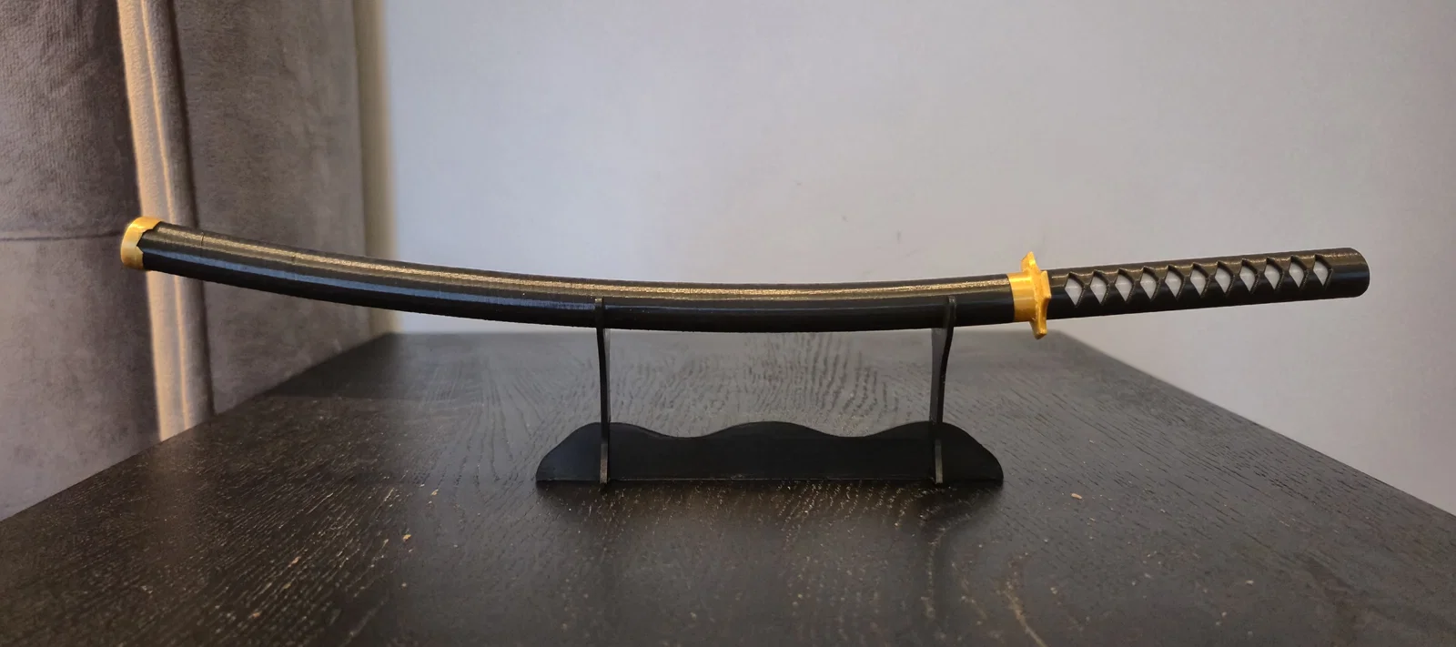 Mẫu katana này được thiết kế dựa trên tỷ lệ chuẩn của một thanh kiếm thật. ##### Thông số in: Mình thường in ở tỷ lệ 30%, riêng file “pin.stl” thì mình để 28% cho vừa vặn hơn. Nếu máy in của bạn có độ chính xác cao hoặc bạn chịu khó chà nhám để lắp ráp khít hơn thì cứ thoải mái điều chỉnh nhé. LƯU Ý QUAN TRỌNG!: File “pin.stl” có độ cong nhẹ để khớp với phần lưỡi kiếm. Hãy cẩn thận khi in vì phần đáy sẽ không phẳng, có thể gây mất ổn định khi in. Đừng quên xoay ngược chi tiết này 180° trước khi in nhé! Đổi màu: Với file “Blade.stl”, bạn cần đổi màu cho phần tsuba và habaki. Các phần còn lại chỉ cần in đơn sắc. Giá đỡ: Giá đỡ đã có sẵn trên trang của mình, bạn nhớ phải scale giá đỡ theo đúng tỷ lệ mà bạn đã dùng cho thanh katana nhé! Mình thấy tỷ lệ 30% là chuẩn nhất. ##### Lắp ráp: Bạn chỉ cần dùng keo dán sắt để gắn chốt (pin) vào tay cầm và lưỡi kiếm. Chốt được thiết kế ngắn hơn một chút để đảm bảo vừa khít. Vì vậy, hãy lắp chốt vào tay cầm trước rồi mới gắn vào lưỡi kiếm. Phần mũi kiếm và lưỡi kiếm của mình thì khớp rất chặt nên không cần dùng keo. Rất mong được xem những phiên bản phối màu độc đáo hoặc các bản in hoàn thiện hơn của mọi người.