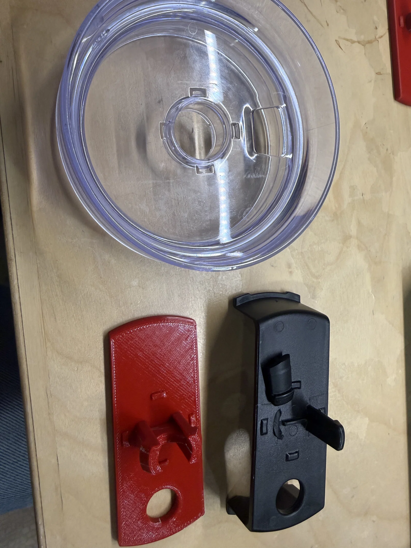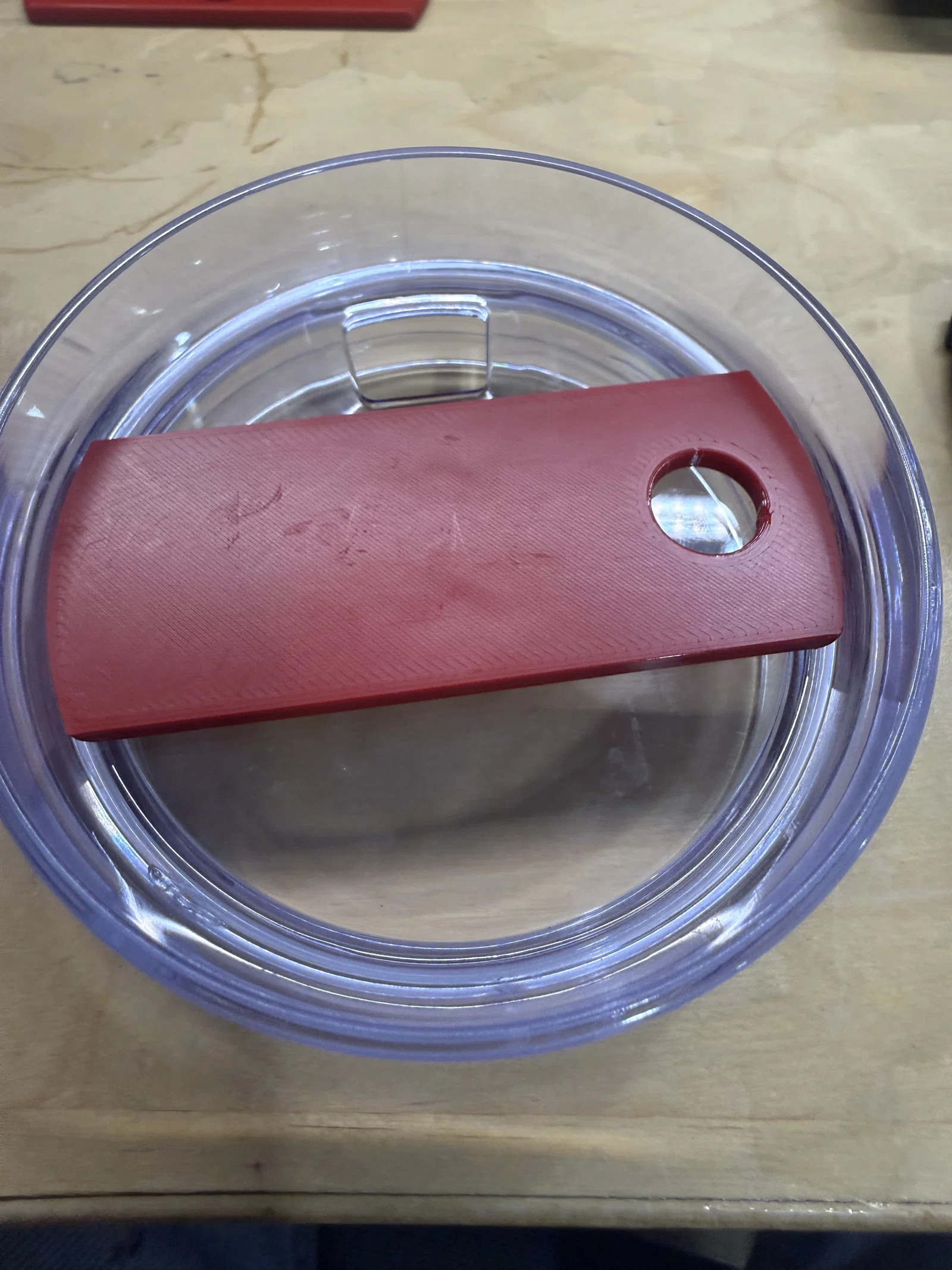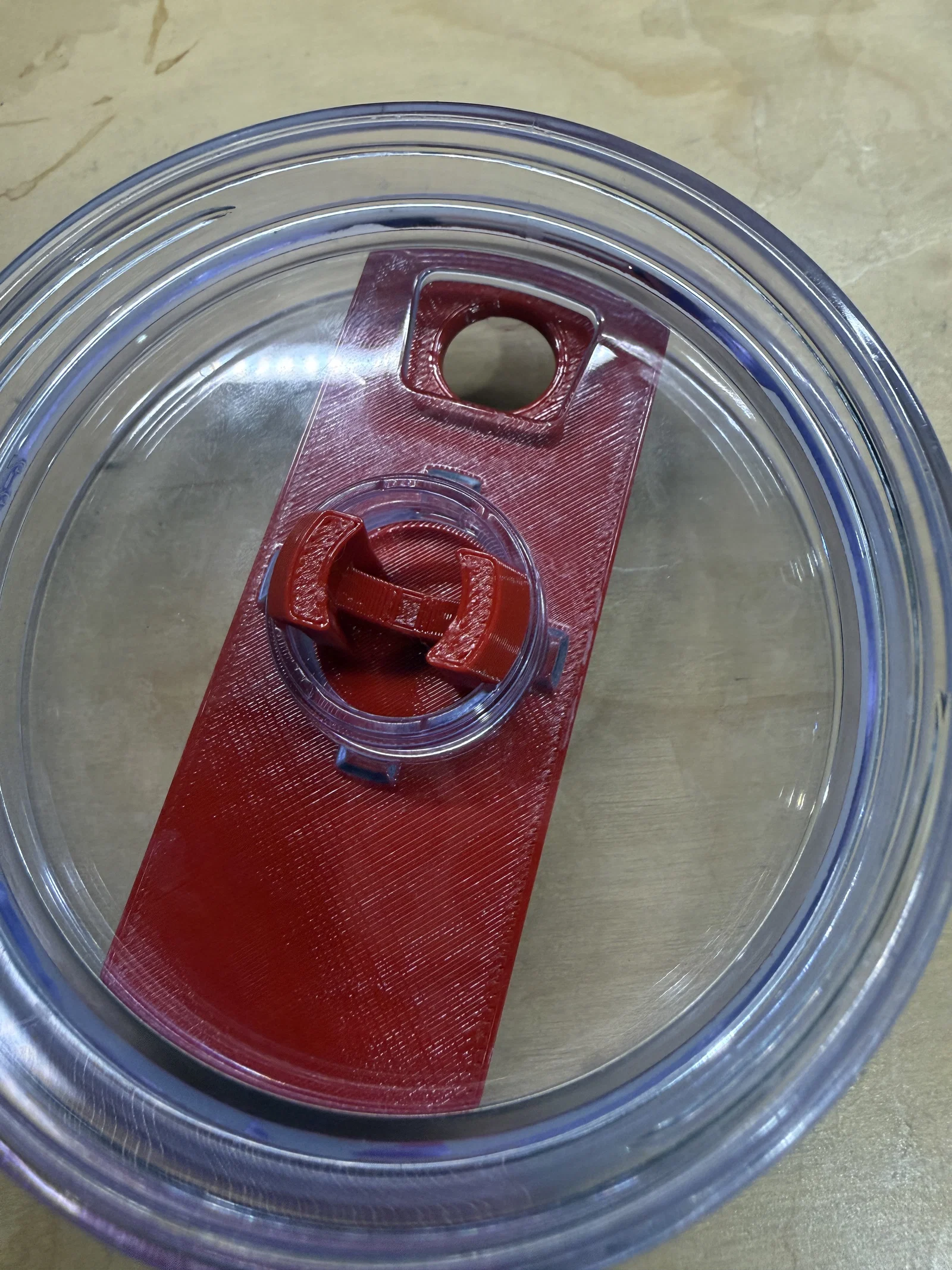 Cái chốt giữ nắp đậy của ly bị gãy, nên mình đã thiết kế cái này để thay thế. Nó là một phần của cái ly lớn (khoảng 1 lít?) mà vợ mình được tặng từ Hội Chữ thập đỏ. Mình in bằng nhựa TPU để dễ gắn vào hơn, nhưng bạn cũng có thể dùng các loại nhựa khác.