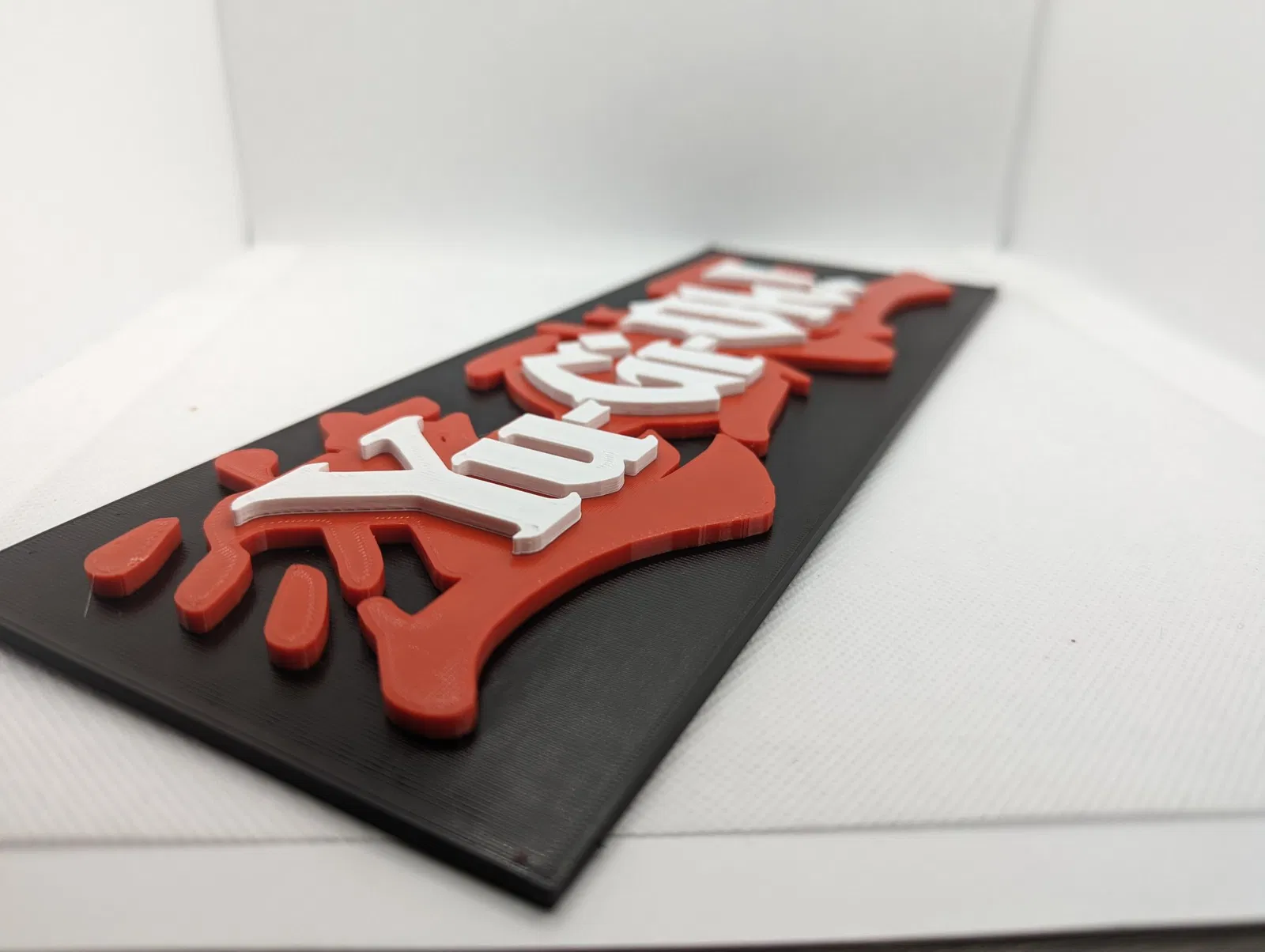 Một dấu hiệu 3D của logo Yugioh đạt được nhiều màu thông qua các tạm dừng chiều cao lớp.
