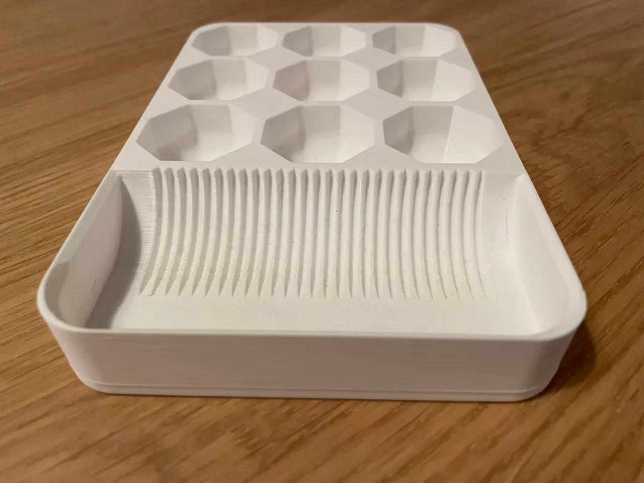 Một khay trộn sơn 9 ngăn, được thiết kế cho một lượng nhỏ sơn hobby. Một ngăn lớn hơn với các rãnh ở một đầu để làm cho việc làm sạch cọ nhanh chóng và dễ dàng. Một góc vát trong khu vực làm sạch cọ để dễ dàng đổ ra mà không gây lộn xộn.