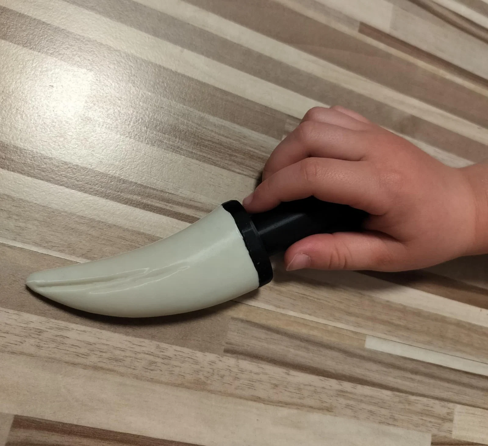 Việc in 3D mô hình này giúp bạn dễ dàng tạo ra một món đồ chơi cá nhân hóa với độ bền cao và chi tiết sắc nét. Cấu trúc của mô hình gồm hai phần chính: phần cán dao cầm chắc tay và phần lưỡi dao mô phỏng hình chiếc răng khủng long đầy uy lực. Bạn có thể tự do sáng tạo màu sắc cho sản phẩm, chẳng hạn như dùng nhựa màu trắng ngà hoặc giả xương cho phần răng, và màu đen hoặc nâu cho phần cán để tạo vẻ ngoài chân thực nhất.