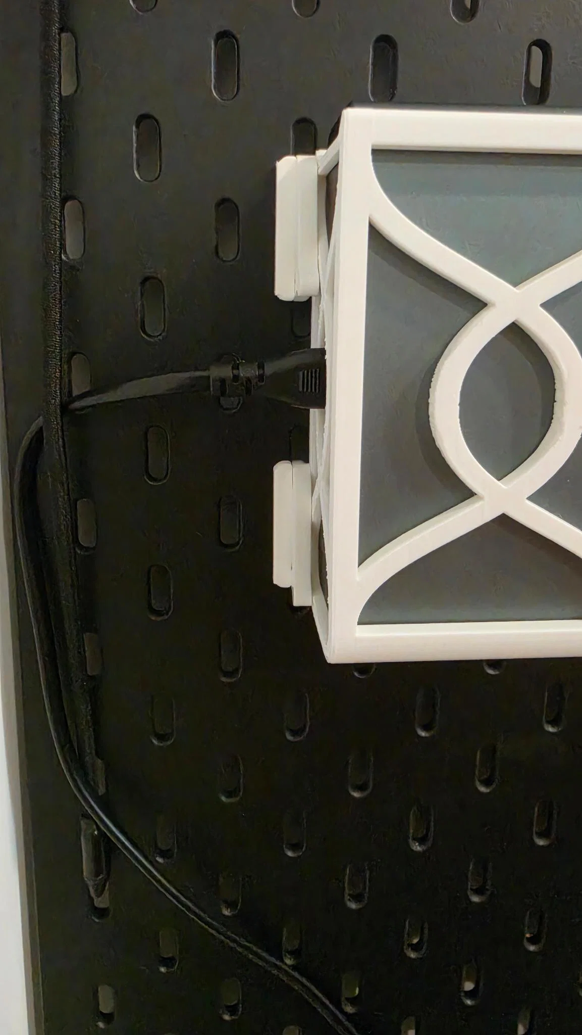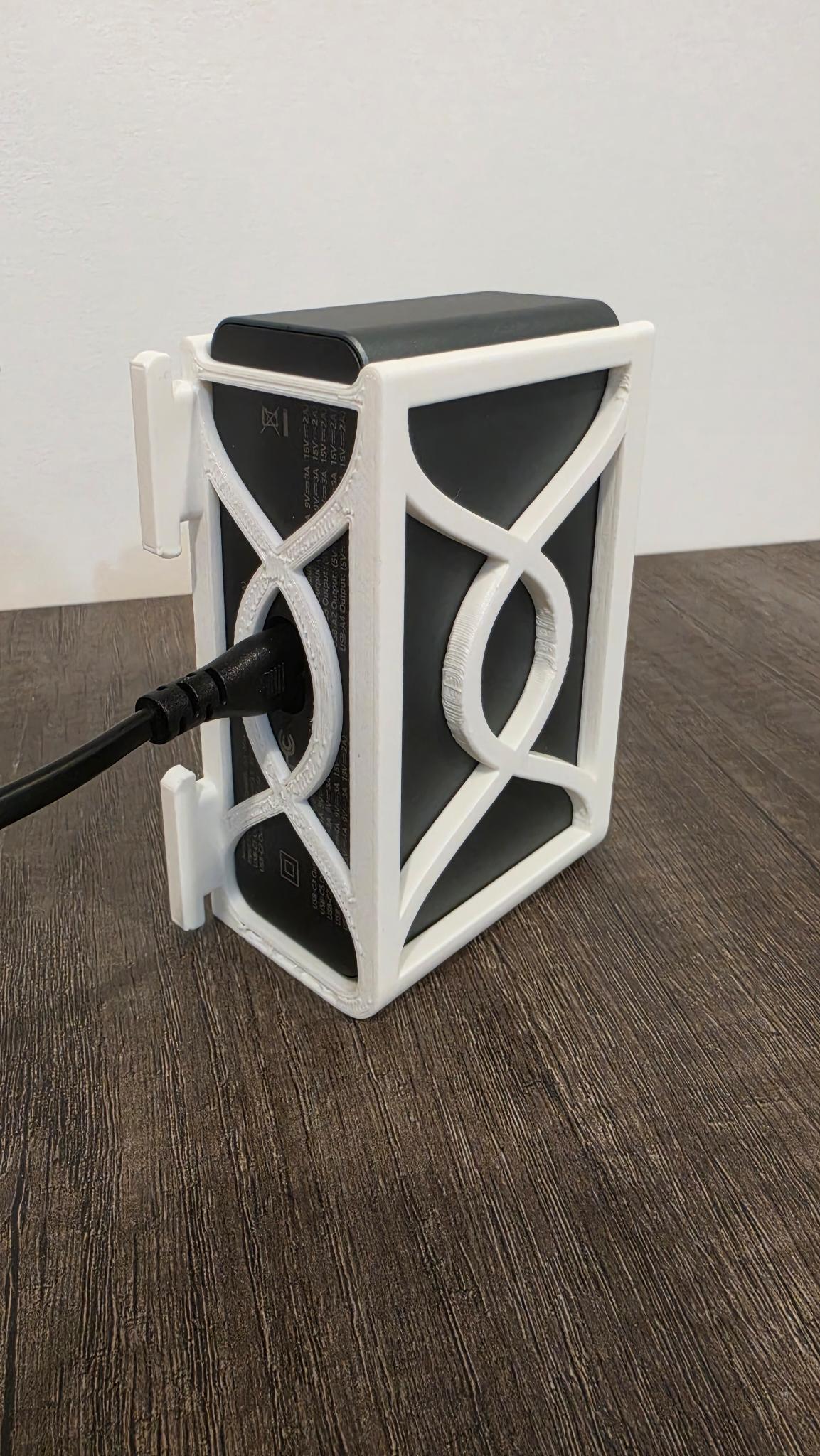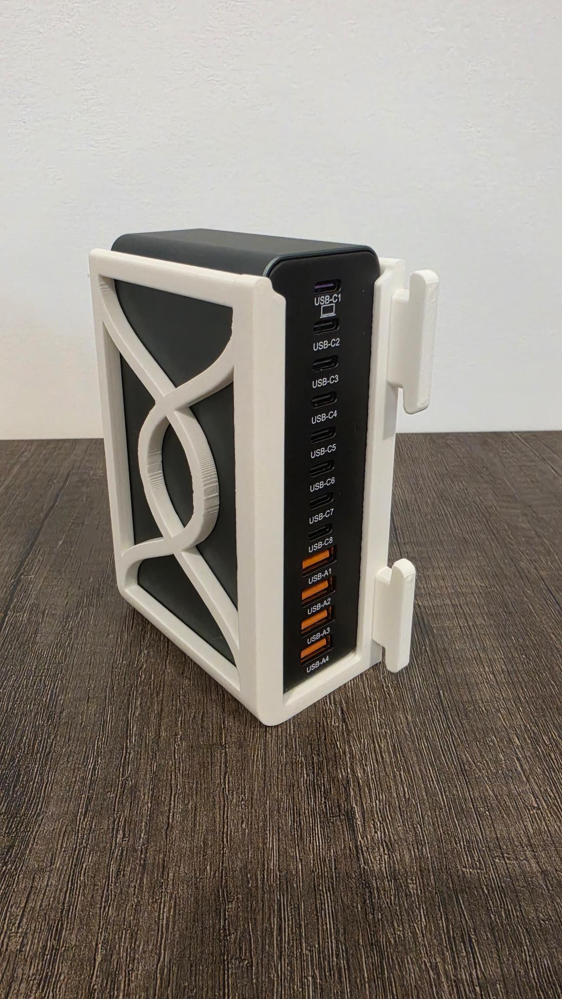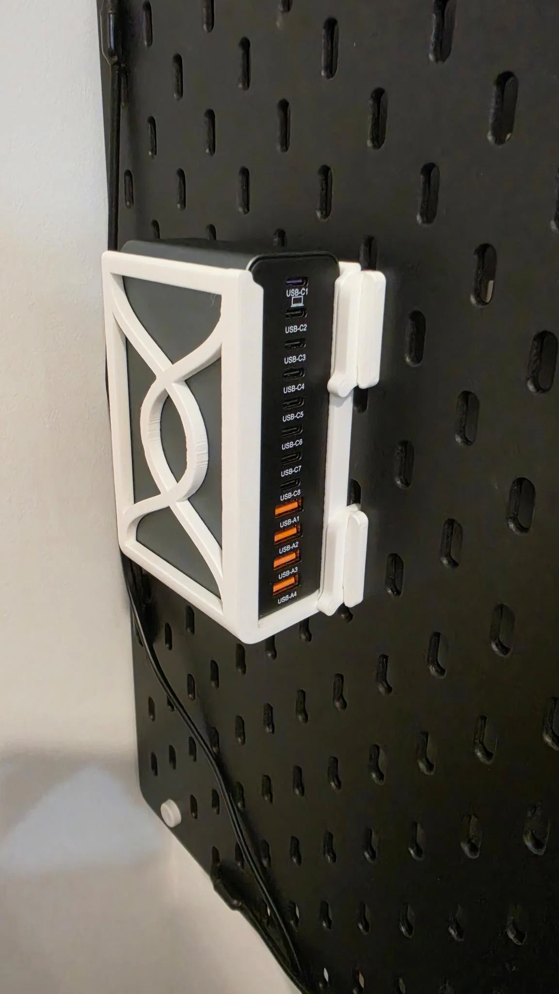Sử dụng thiết kế cơ chế khóa Skadis tuyệt vời từ @mkingery, mình đã gắn cố định hub sạc gần nơi đặt các thiết bị cần sạc.
