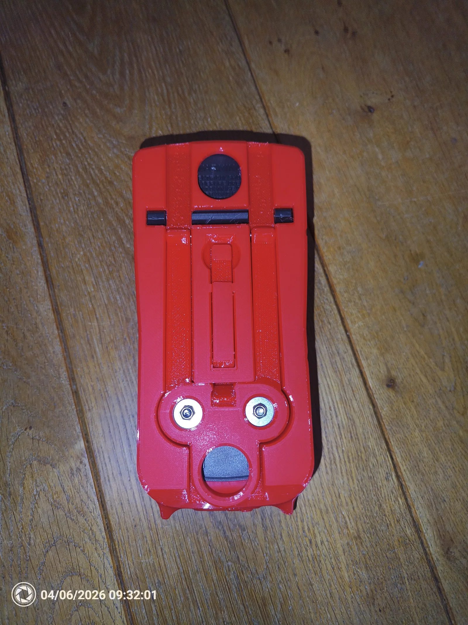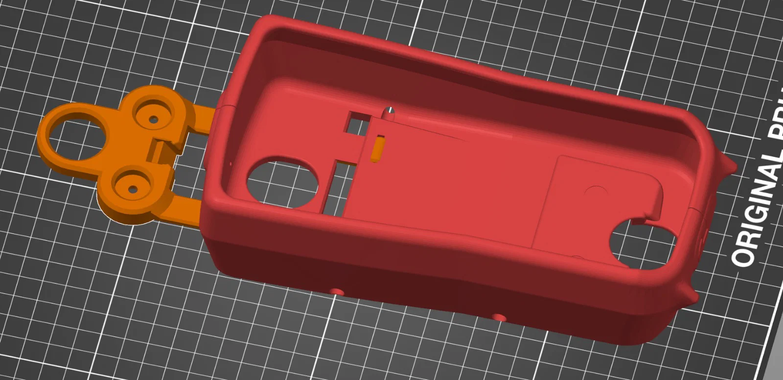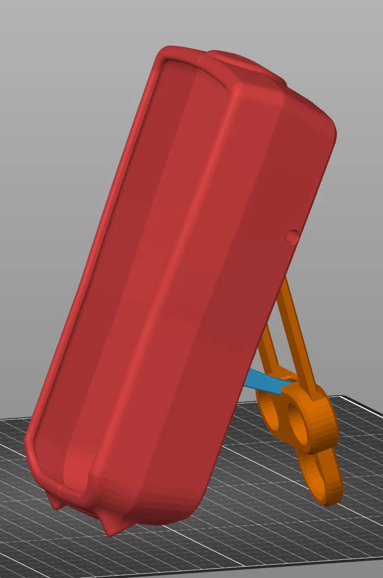 Version 3 (in màu đỏ trong suốt) rộng hơn ở đáy, có thêm một phần để dựng đứng dễ hơn (giữ phần treo có nam châm tạo góc 40 độ so với thân chính). Tiếc là model này thiếu vài thứ nên mình làm version 4 (in đỏ đặc/đục lại):