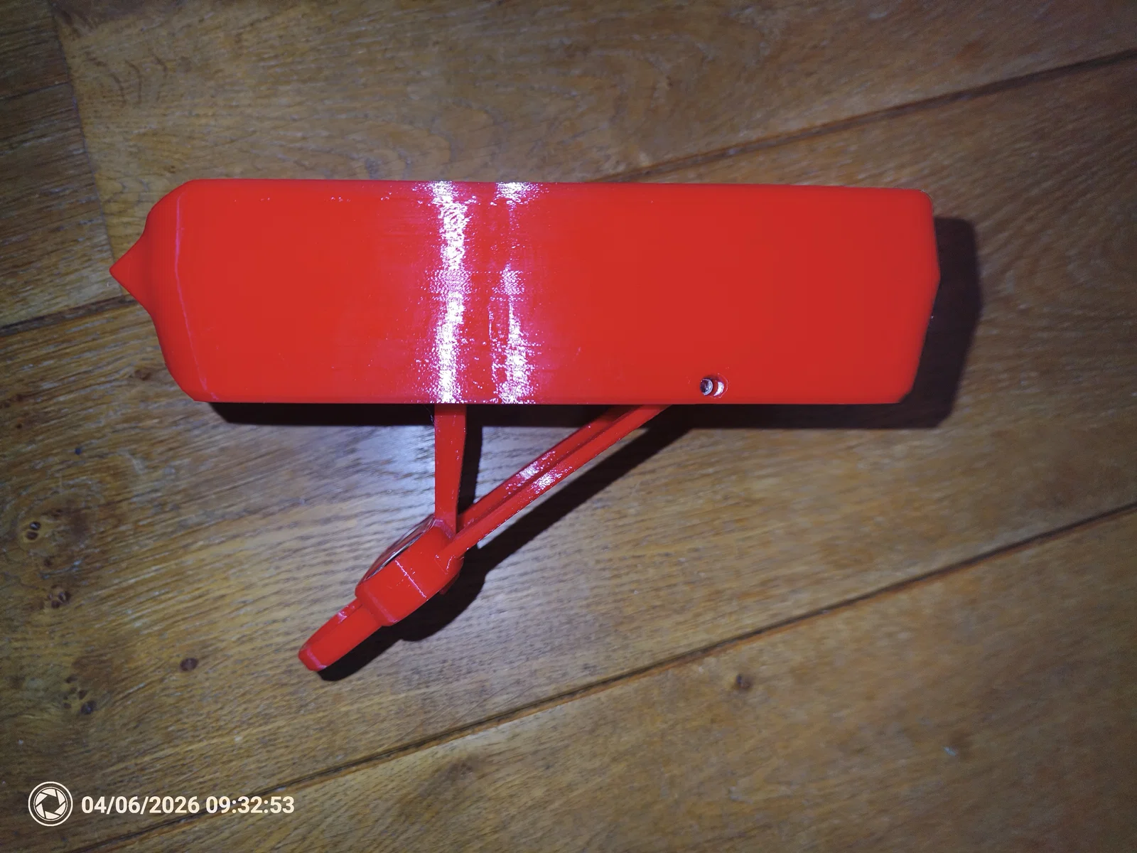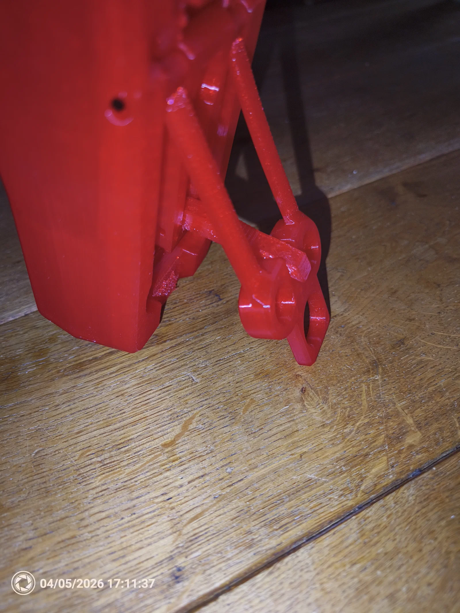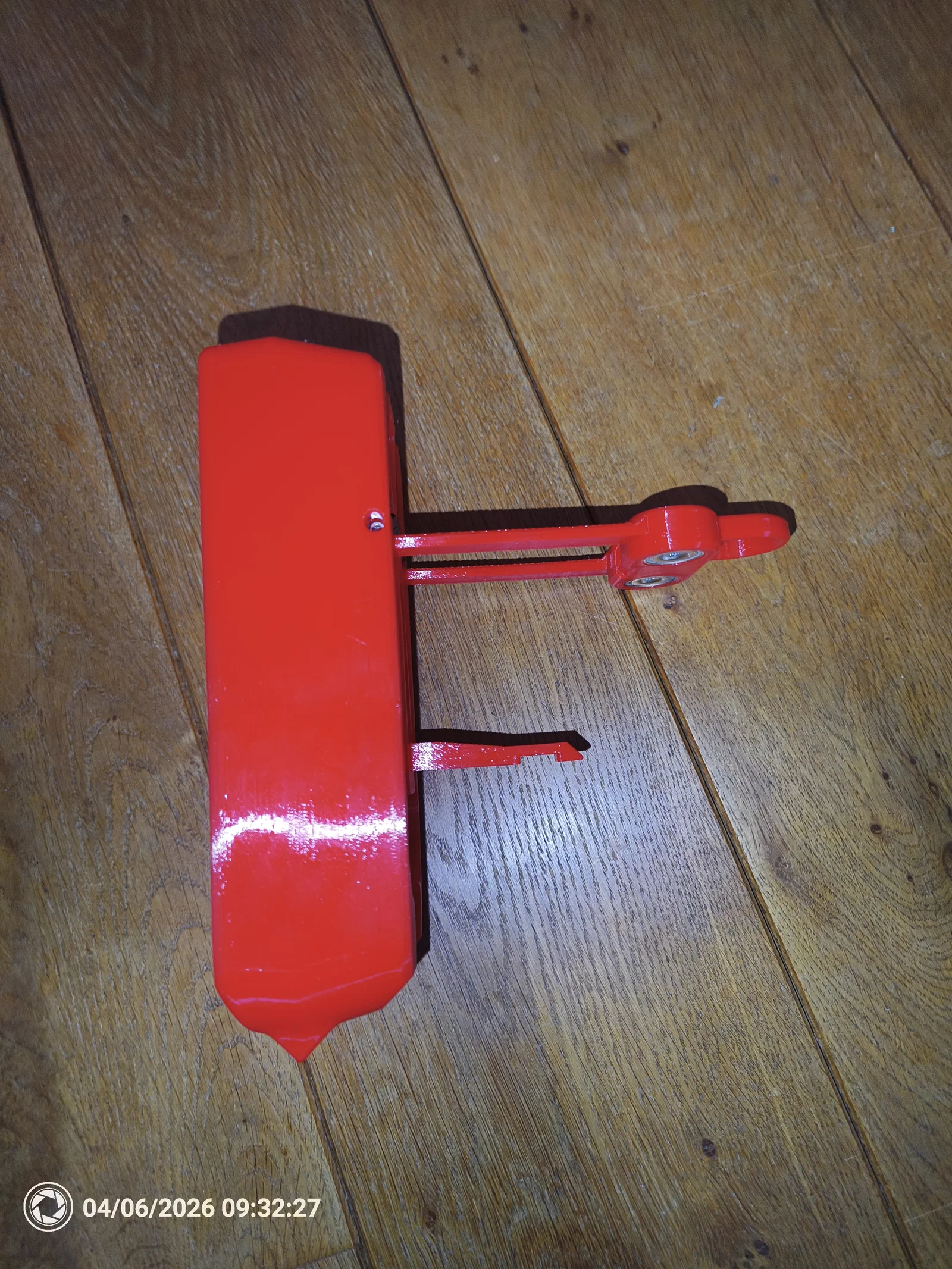 Version 3 (in màu đỏ trong suốt) rộng hơn ở đáy, có thêm một phần để dựng đứng dễ hơn (giữ phần treo có nam châm tạo góc 40 độ so với thân chính). Tiếc là model này thiếu vài thứ nên mình làm version 4 (in đỏ đặc/đục lại):
