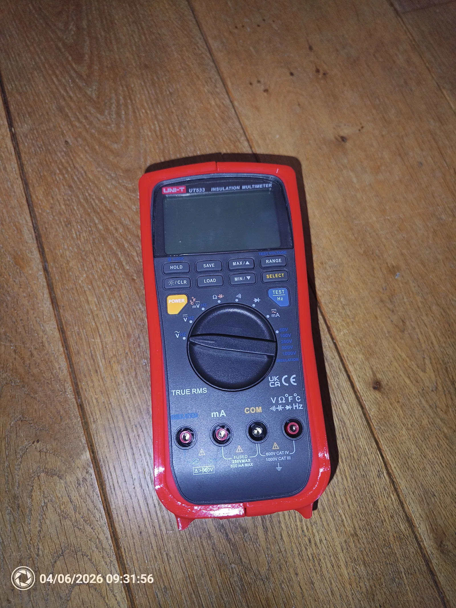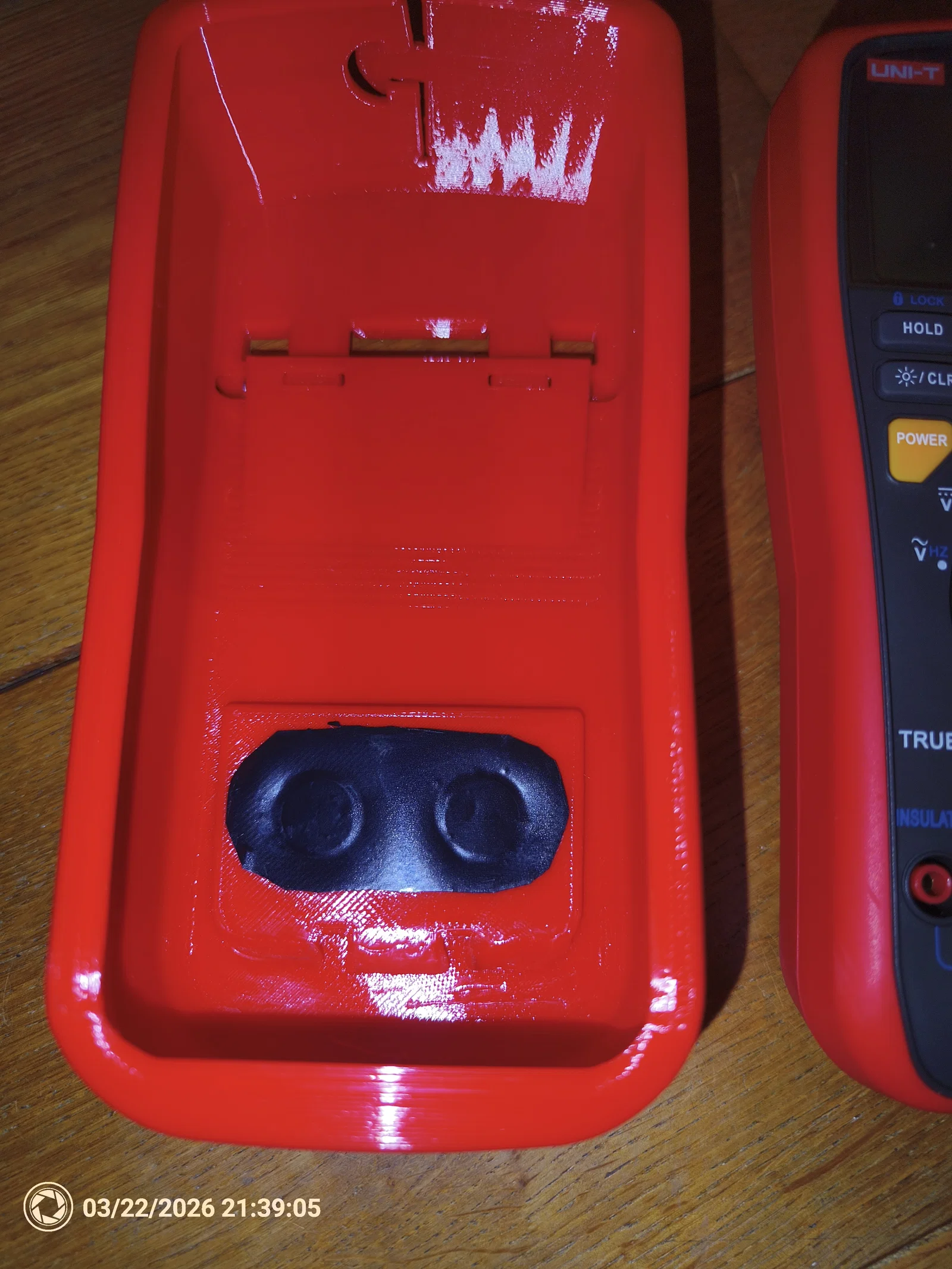 3. Hãng UNI-T cũng ổn nhưng không phải Fluke (mình thấy Fluke đa phần chất lượng hoàn thiện rất tốt, trừ mấy cái current clamp dùng dây — mà thôi chuyện đó để bữa khác). Nên có thêm bảo vệ sẽ yên tâm hơn. Vì vậy mình làm một vỏ TPU. Vỏ này cũng bảo vệ luôn cái núm xoay (dial) phía trước; nếu meter bị nghiêng rồi đập mặt trước xuống, cái dial (vừa khít) sẽ không chạm xuống bề mặt