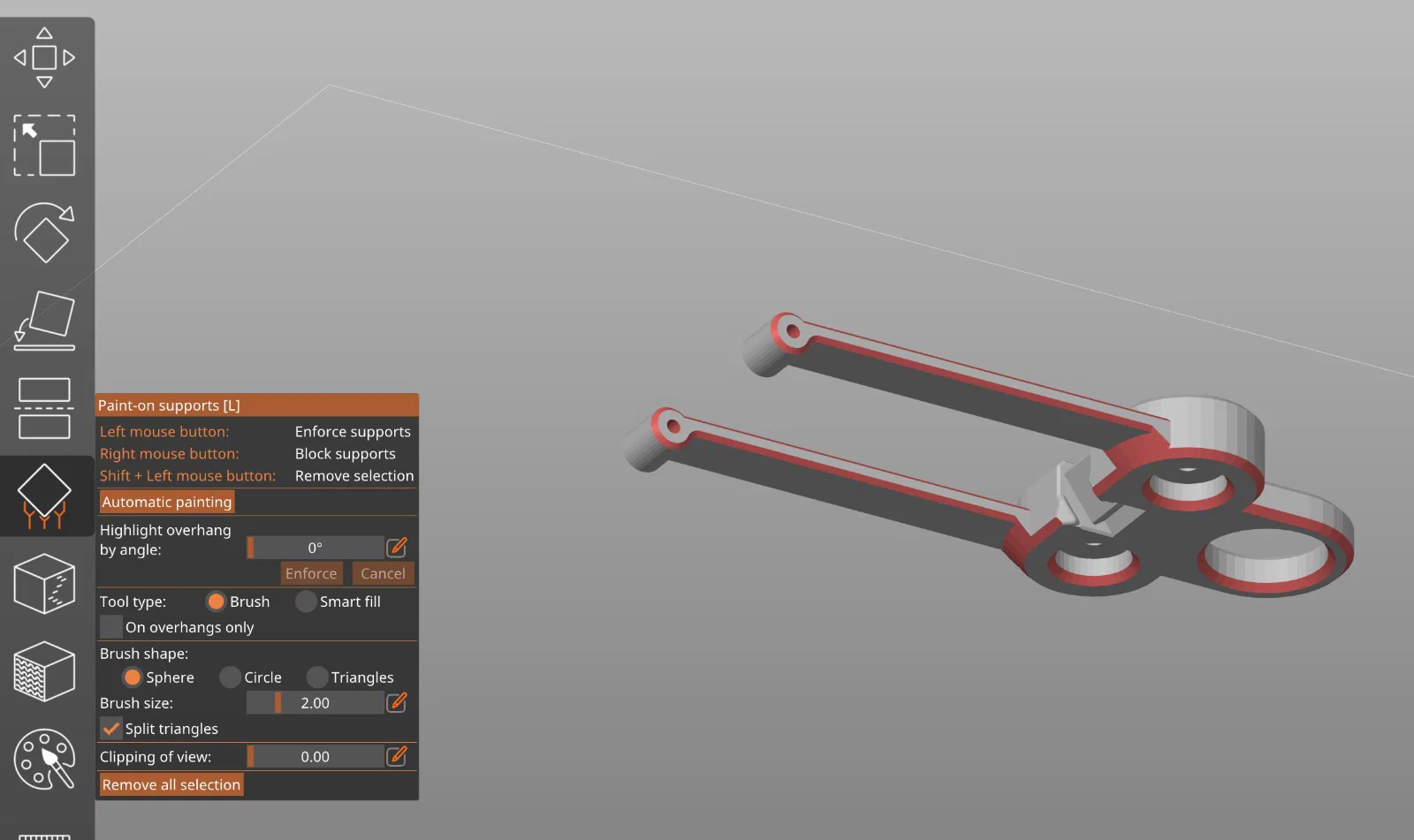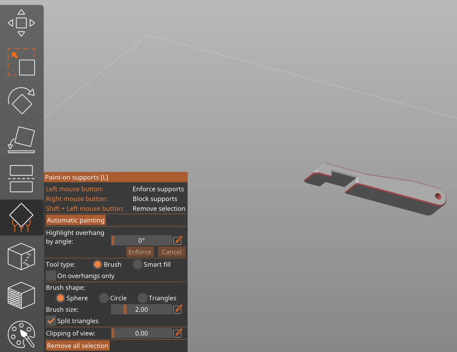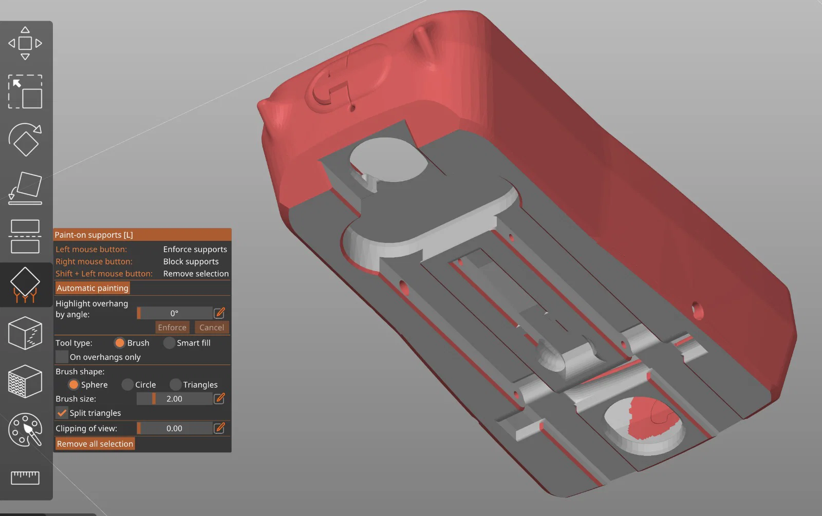 Nếu bạn có máy in MMU, dùng vật liệu khác cho supports sẽ dễ gỡ hơn. Nếu không có MMU, bạn có thể tăng khoảng cách giữa supports và bề mặt phía trên supports. Một ý khác là tạm dừng in ngay sau khi in xong supports, rồi bôi glue stick lên mặt supports để khi in xong có thể hoà tan lớp keo trong nước (hoặc có thể lớp keo sẽ ngăn supports dính vào bề mặt phía trên.)