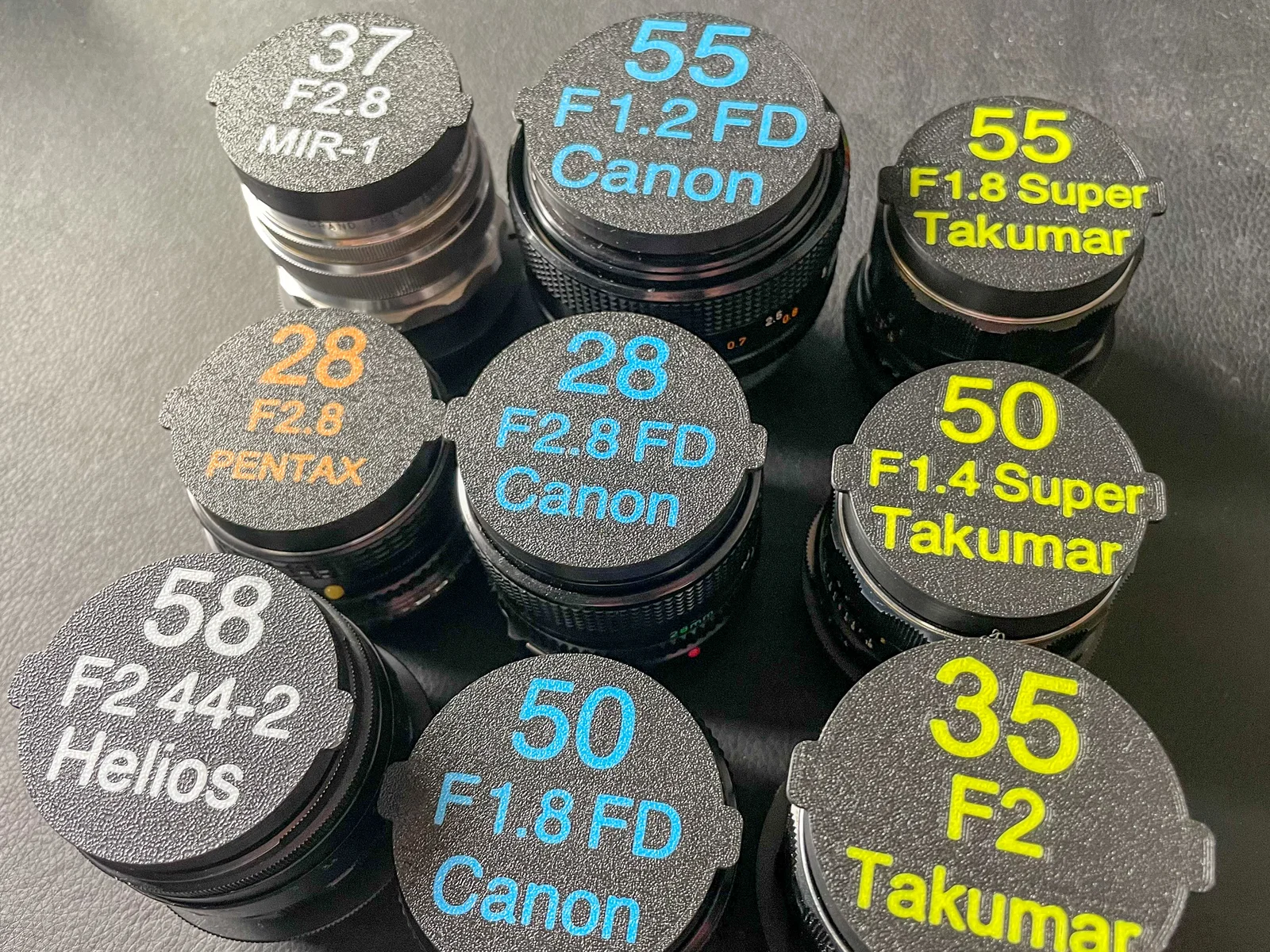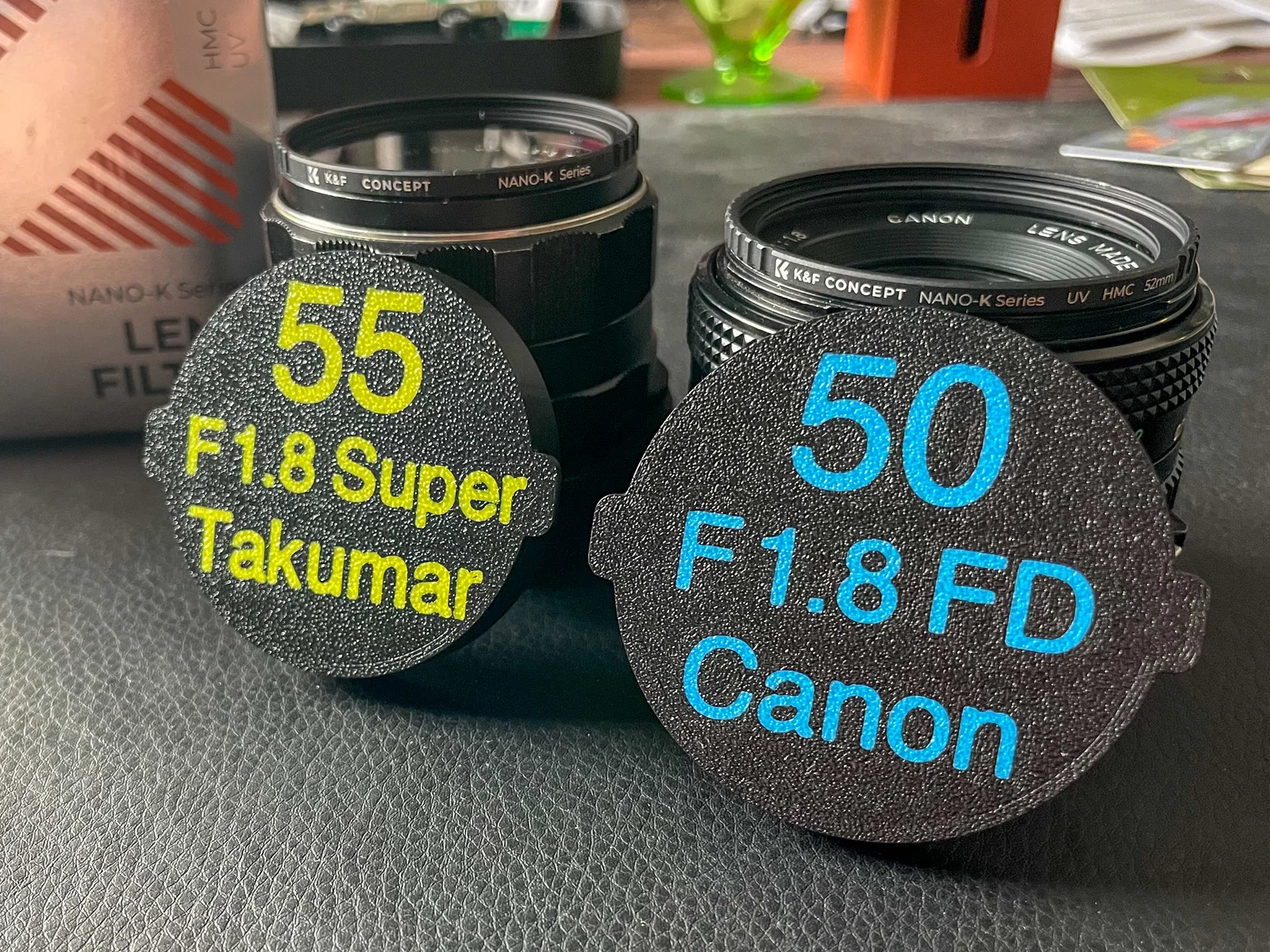 Trong quá trình sắp xếp lại bộ sưu tập ống kính vintage, mình gặp khó khăn trong việc tìm kiếm nắp đậy ưng ý nên đã tự thiết kế riêng. Mục tiêu của mình là tạo ra loại nắp đậy dạng ấn (push-on), có không gian để dán nhãn lớn, có phần gờ để dễ tháo lắp và đặc biệt là phải bám chặt vào kính lọc (filter) gắn trên ống kính. Cụ thể hơn, mình thiết kế để dùng cho các loại kính lọc UV K&F Concept hiện đại có viền khía mà mình đang dùng trên tất cả ống kính.