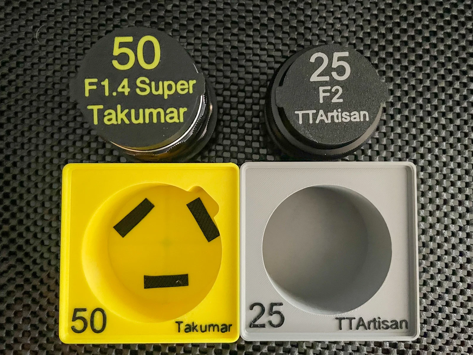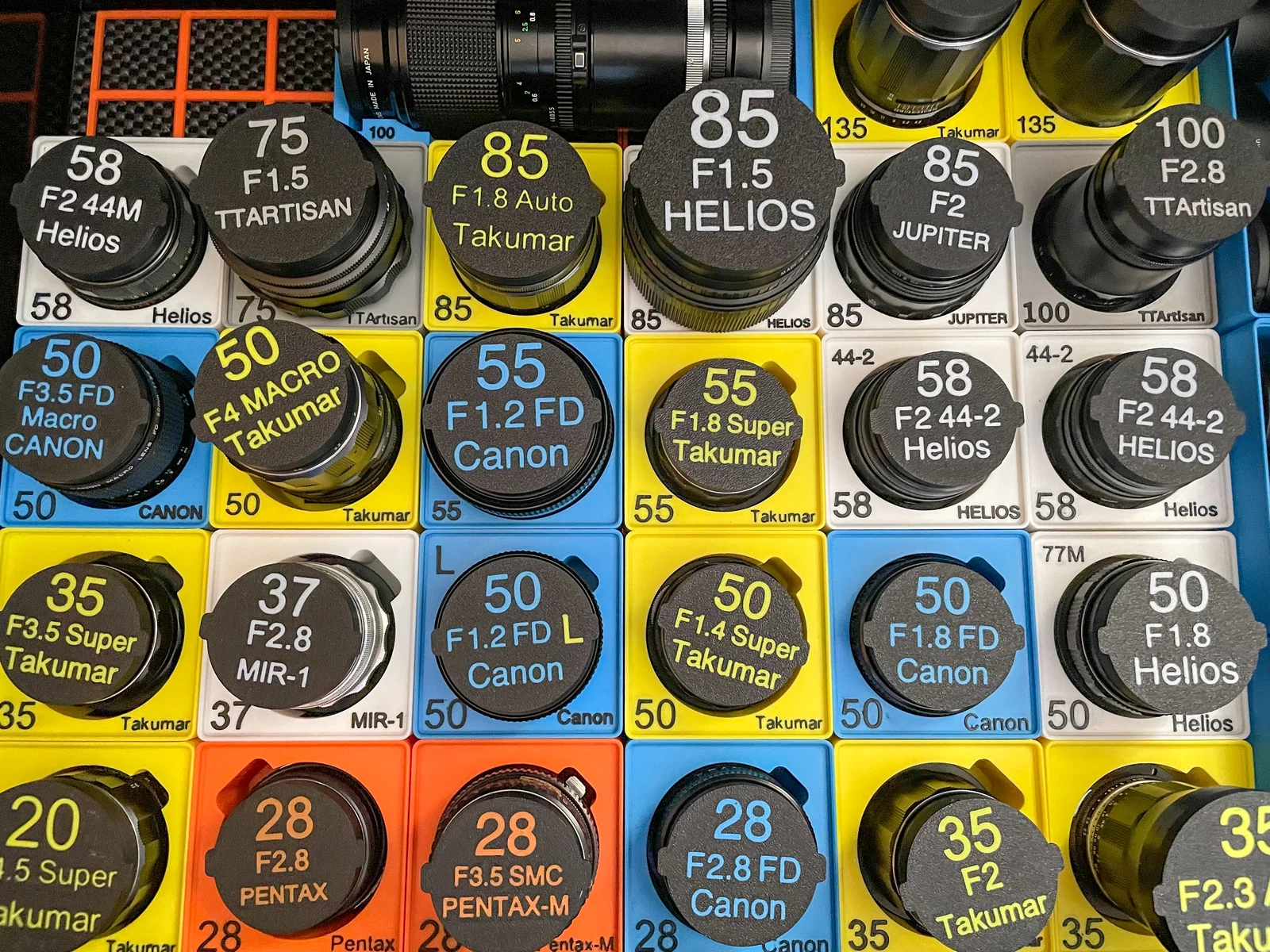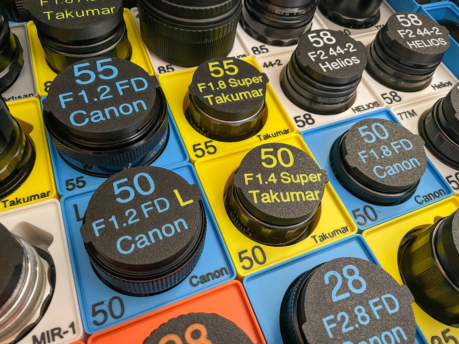 Giải pháp lưu trữ ống kính vintage chuyên dụng cho hệ thống Gridfinity. Thiết kế đa năng, hỗ trợ nhiều dòng lens (Canon FD, Helios, Takumar...), cho phép tùy chỉnh nhãn và thêm đệm lót để bảo vệ ống kính an toàn, gọn gàng.