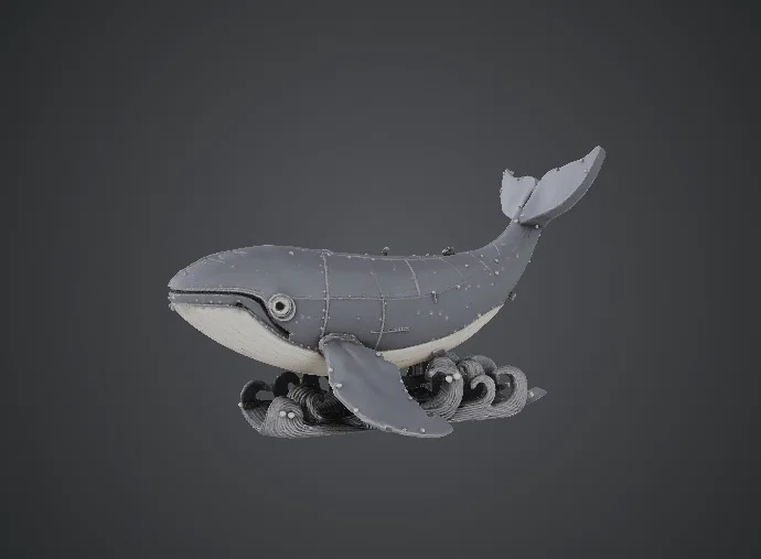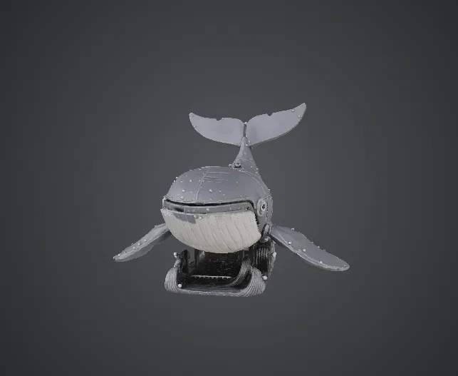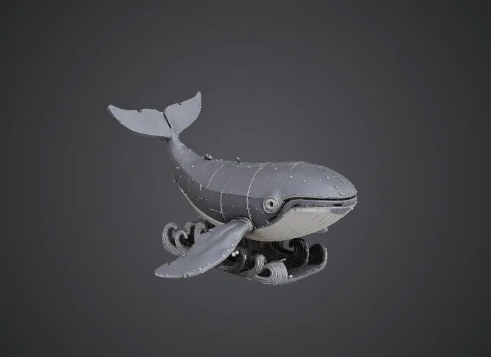 Mẫu cá voi cơ khí kết hợp hình dáng sinh vật đại dương cùng những chi tiết công nghiệp tỉ mỉ. Thiết kế bao gồm các tấm đinh tán và hệ thống ống dẫn, mang lại vẻ ngoài ấn tượng, rất lý tưởng để sơn màu giả cổ hoặc phong cách kim loại.