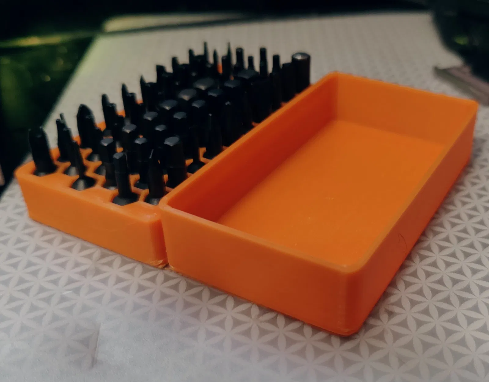 Được in với Hatchbox Orange PLA. 190c, khoảng 15% infil hình lập phương thích ứng. Tôi đã in ở khoảng 102% để dễ dàng đưa các bit vào và ra. Không cần nam châm. Ảnh là bản in đầu tiên của tôi trước khi tôi thêm khóa snap. Vẫn đang tinh chỉnh điều đó.