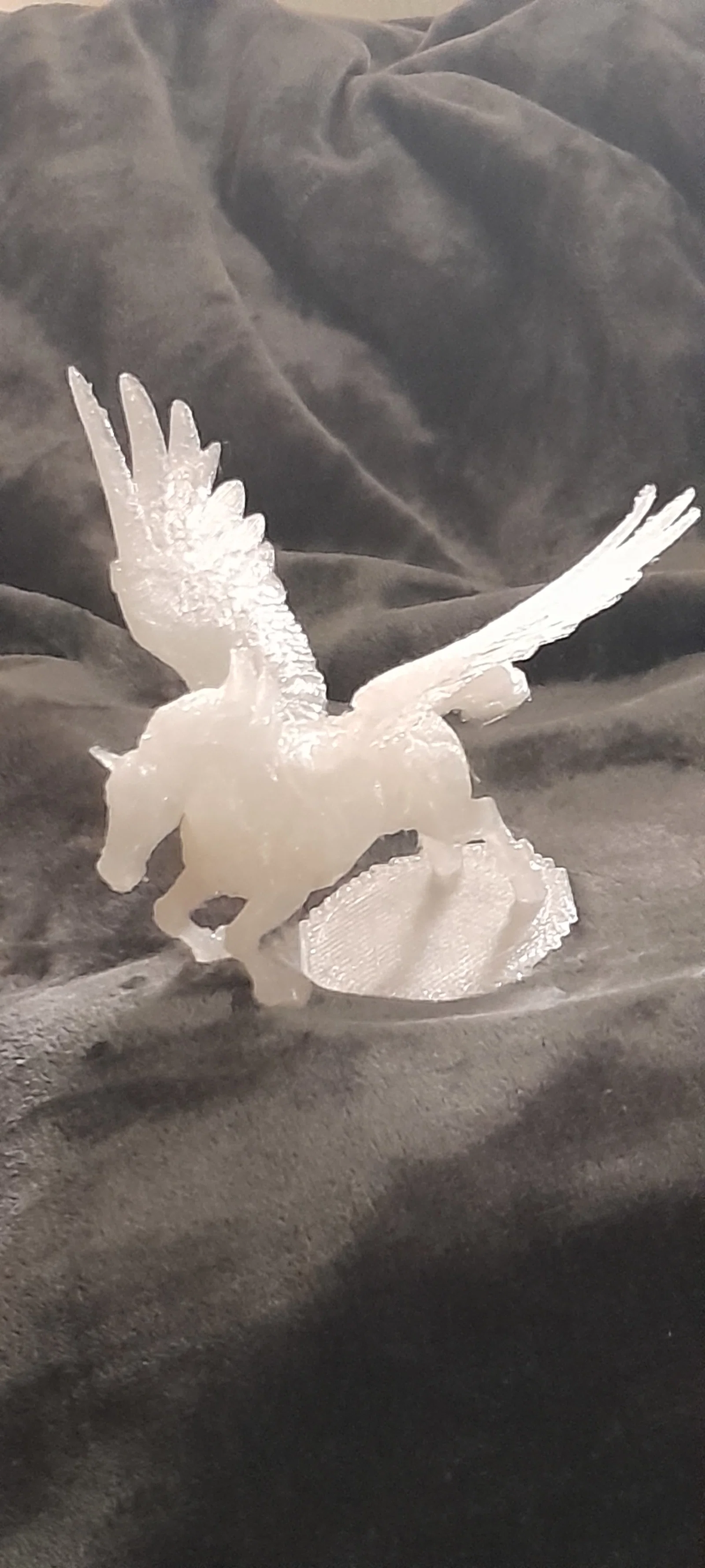 Đây là mô hình Pegasus có cánh. Mình đã in với độ dày (infill) 100% để mô hình được đặc và chắc chắn. Mình có tăng độ cao phần đế lên để cân bằng với trọng lượng của mô hình. Các thiết lập hỗ trợ (supports) bao gồm: Normal, Grid, 12, Build plate only, và đã chọn Remove small overhangs. Lưu ý là hồ sơ (profile) cắt lát của bạn cần được cân chỉnh kỹ về vấn đề stringing. Mình in bằng nhựa SUNLU Transparent PLA và sử dụng profile cho đầu phun (nozzle) 0.6mm. Nếu dùng nozzle 0.4mm thì vẫn in tốt nhưng sẽ tốn nhiều thời gian hơn. Nếu các bạn in thử, vui lòng chia sẻ thành phẩm nhé. Mình rất muốn xem thiết lập và loại nhựa bạn dùng cũng như nhận phản hồi để hoàn thiện mô hình tốt nhất có thể. Bức ảnh hiện tại là bản in trước khi mình tăng độ cao phần đế, vì nó bị cong nếu phần đế bên dưới mô hình mỏng hơn 3 lớp. Mình sẽ cập nhật ảnh mới sau khi in xong. File hiện tại đã bao gồm phần đế lớn hơn rồi.