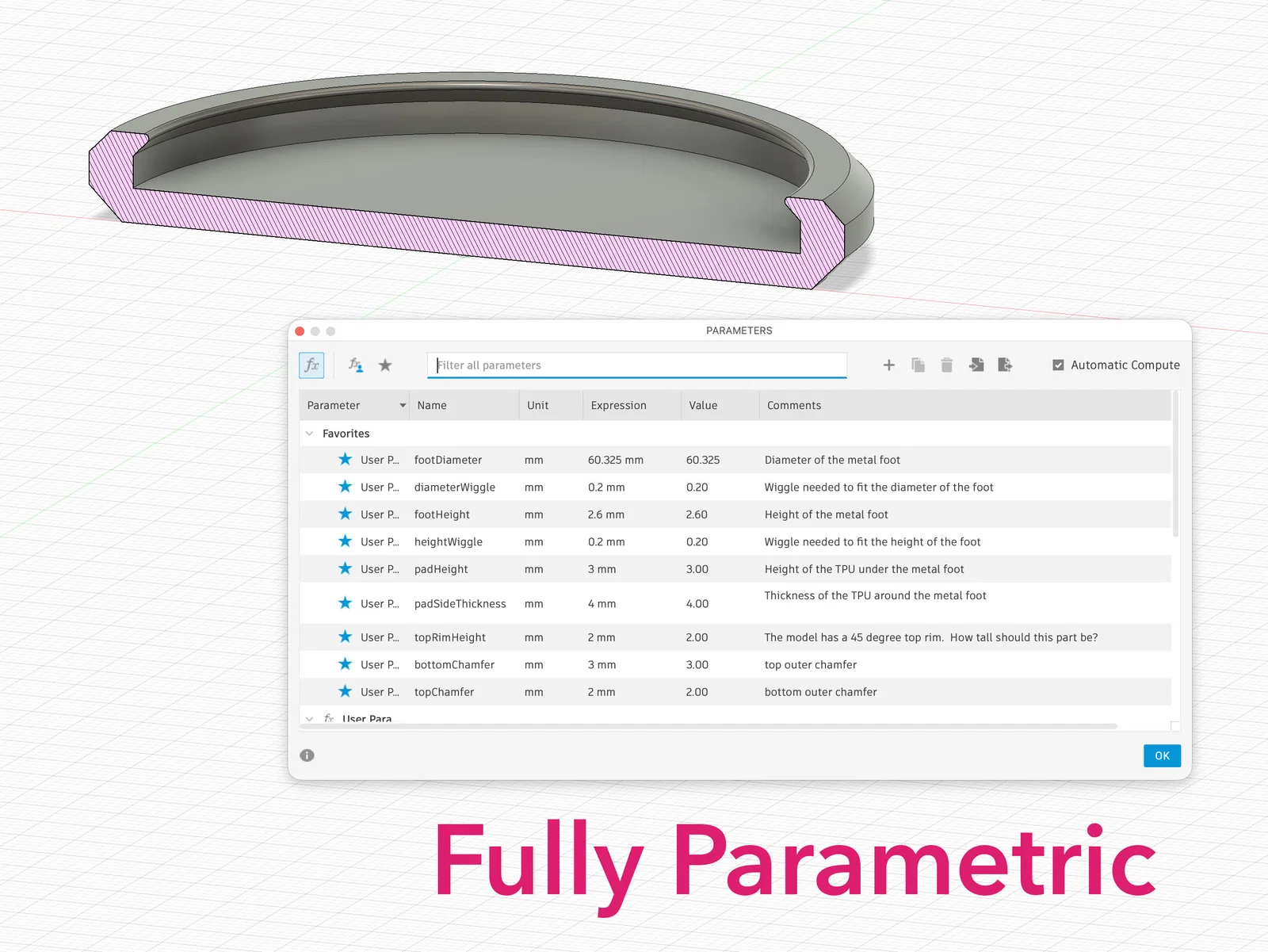 Mình vừa tận dụng được mấy cái chân tăng chỉnh độ cao mà thiếu miếng đệm cao su, nên mình đã tự thiết kế lại. Mấy cái chân tăng chỉnh mình có không hề có nhãn mác hay thông số gì cả. Của mình thì đường kính là 2 3/8 inch và dày 2.6mm. Mình nghĩ chắc ít người dùng đúng cái kích thước này, nên mình đã thiết kế để bạn có thể tùy chỉnh toàn bộ thông số.
