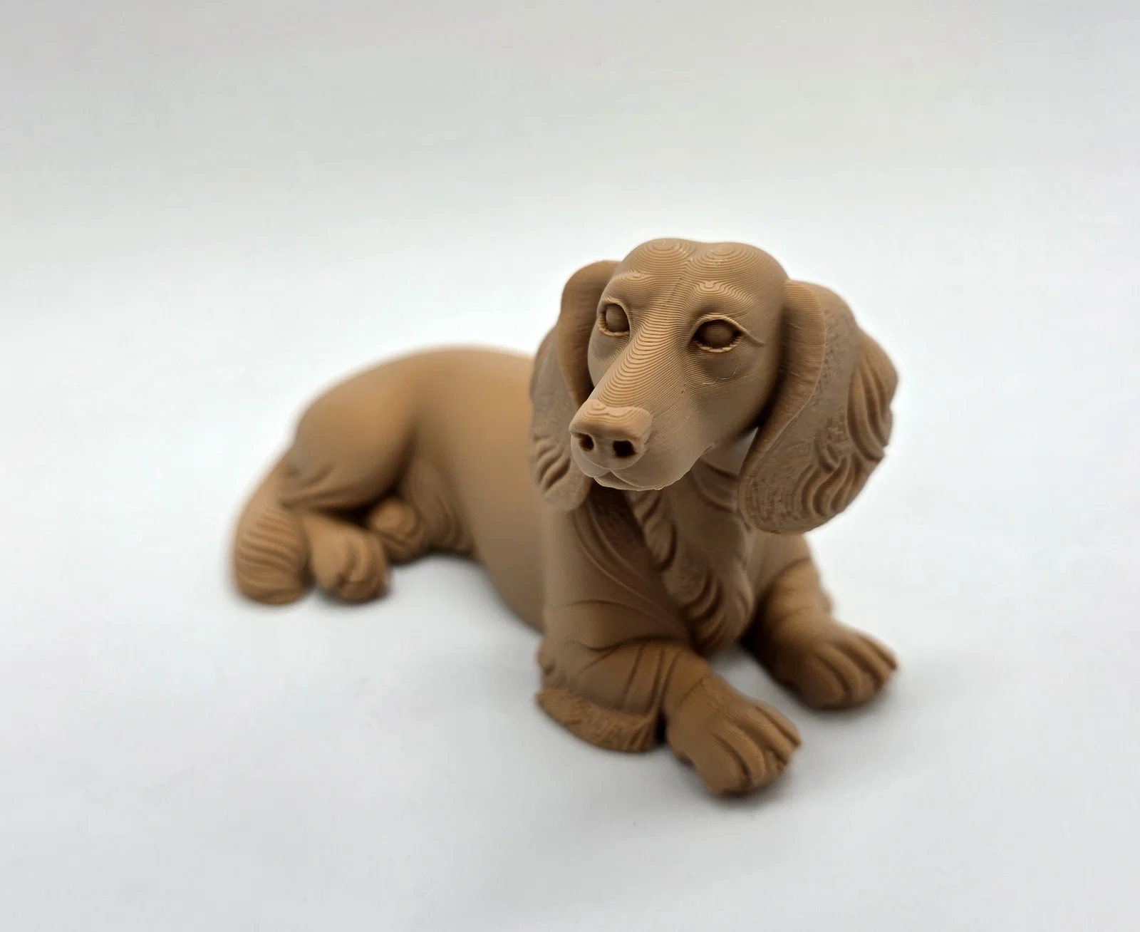 Mô hình tượng chú chó Dachshund lông dài với tư thế đang nằm. Thiết kế đòi hỏi ít support, chi tiết chân thực, là món đồ decor tuyệt vời cho góc làm việc hoặc kệ trang trí của bạn.