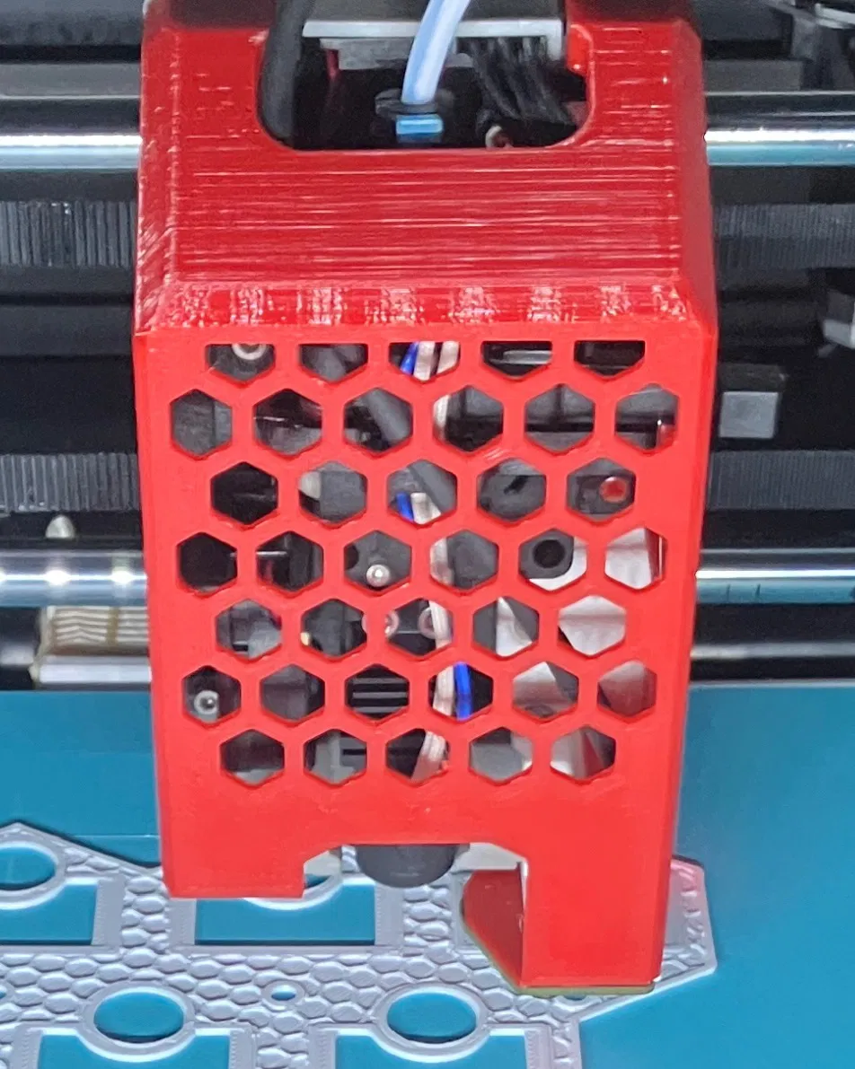 Mình đã tìm ra cách lắp probe vào đúng vị trí của probe gốc trên Qidi. Phải trải qua nhiều lần tinh chỉnh để đảm bảo nó nằm gọn bên trong mép phải, không cấn vào ống dẫn quạt làm mát và đặt gần đầu phun nhất có thể.
