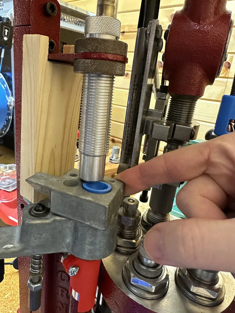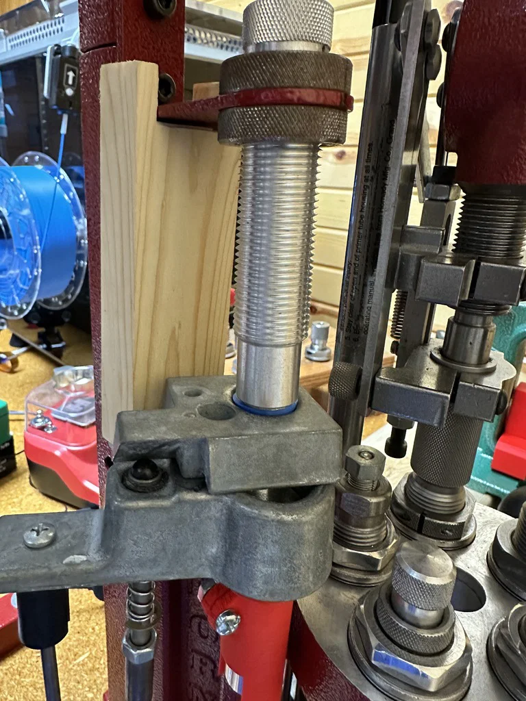 Máy của tôi là đời cũ. Phần tay đòn xoay (Hornady part# 398290) gắn vào ống thép vuông (part# 398447) chỉ bằng một con bu-lông duy nhất. Tôi nhận ra tay đòn này cứ bị xoay lệch dần theo thời gian. Dù tôi đã siết chặt nhưng nó vẫn bị, thậm chí còn làm nứt cả tay đòn kim loại. Nhìn các mẫu mới, tôi thấy Hornady đã thêm miếng thép dập gọi là "Cam Block Clamp" (part# 399691) để giữ cố định. Rất hoan nghênh Hornady vì đã khắc phục lỗi này. Chắc tôi sẽ liên hệ với đội ngũ hỗ trợ khách hàng tuyệt vời của họ để đặt mua cái kẹp đó. Trong lúc chờ đợi, tôi tạm chèn một miếng gỗ giữa tay đòn và giá gắn ống cấp đạn để chống xoay.