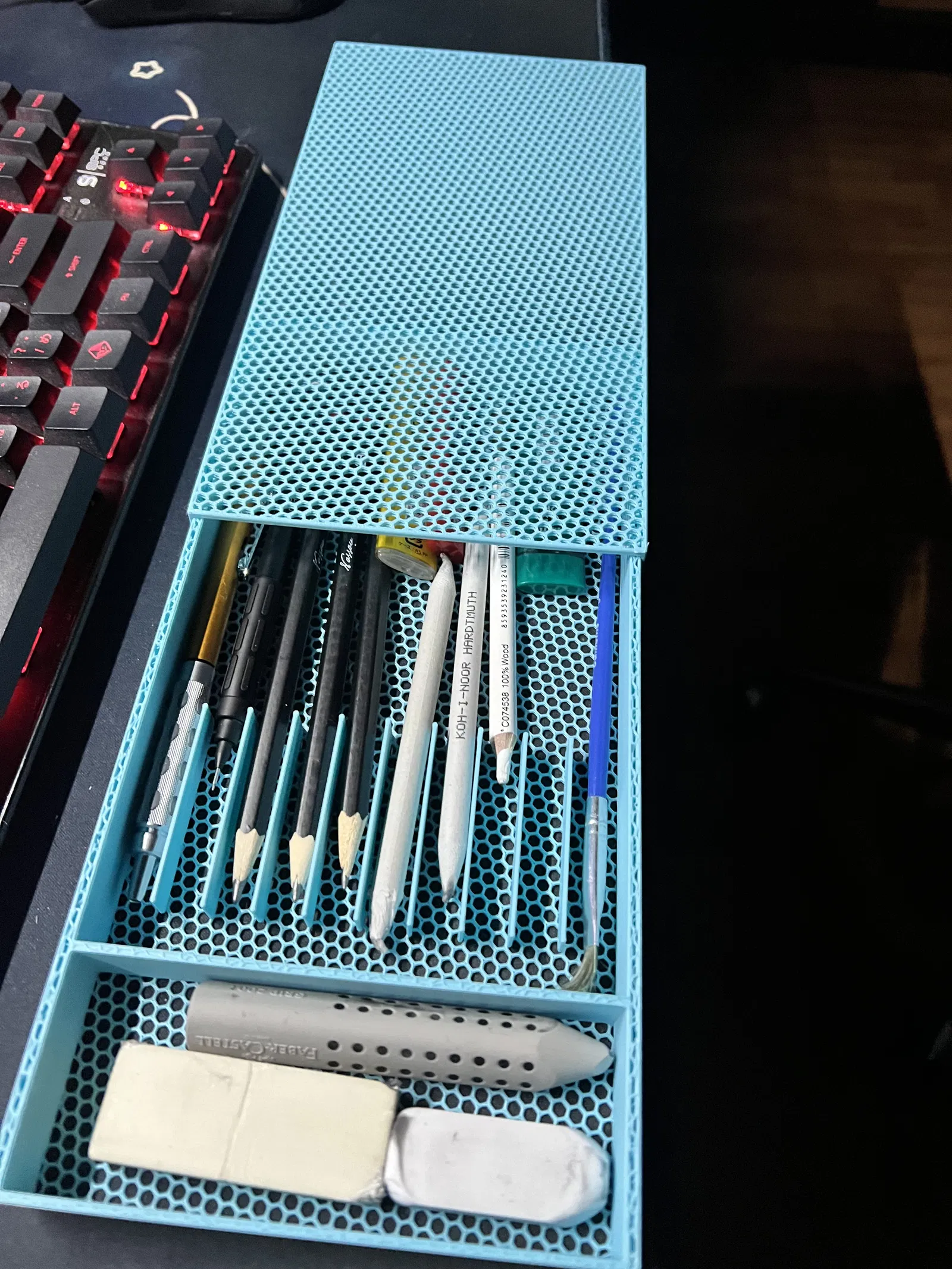 Bạn đang tìm kiếm một giải pháp ngăn nắp cho bàn làm việc vốn dĩ đang bừa bộn với bút chì, tẩy và các phụ kiện vẽ? Chiếc hộp đựng bút (pencil case) được thiết kế bằng công nghệ in 3D này chính là món phụ kiện hoàn hảo giúp bạn sắp xếp không gian làm việc một cách khoa học. Với thiết kế dạng lưới thông thoáng và các vách ngăn thông minh, sản phẩm này không chỉ giữ cho bút của bạn không bị lăn lộn mà còn giúp bạn dễ dàng tìm thấy dụng cụ mình cần ngay lập tức khi đang tập trung làm việc hay học tập.