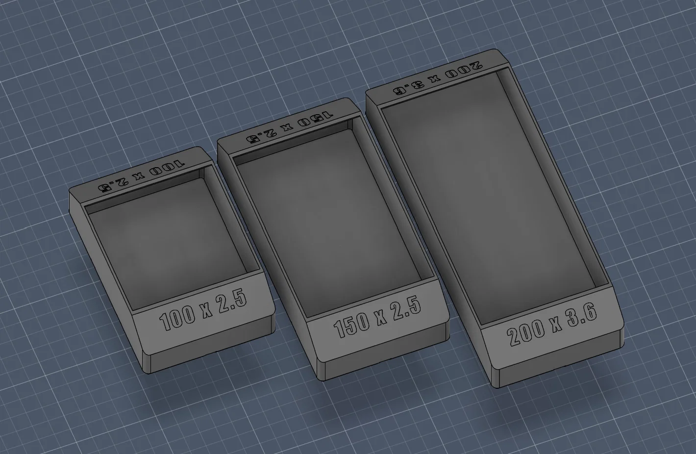 Các mẫu kệ đựng dây rút (zip tie) với nhãn phân loại cho kích thước 100x2.5, 150x2.5 và 200x3.6, thiết kế chuẩn hệ thống Gridfinity. Sản phẩm có sẵn hai kích thước độ rộng là 2 ô và 1.5 ô.