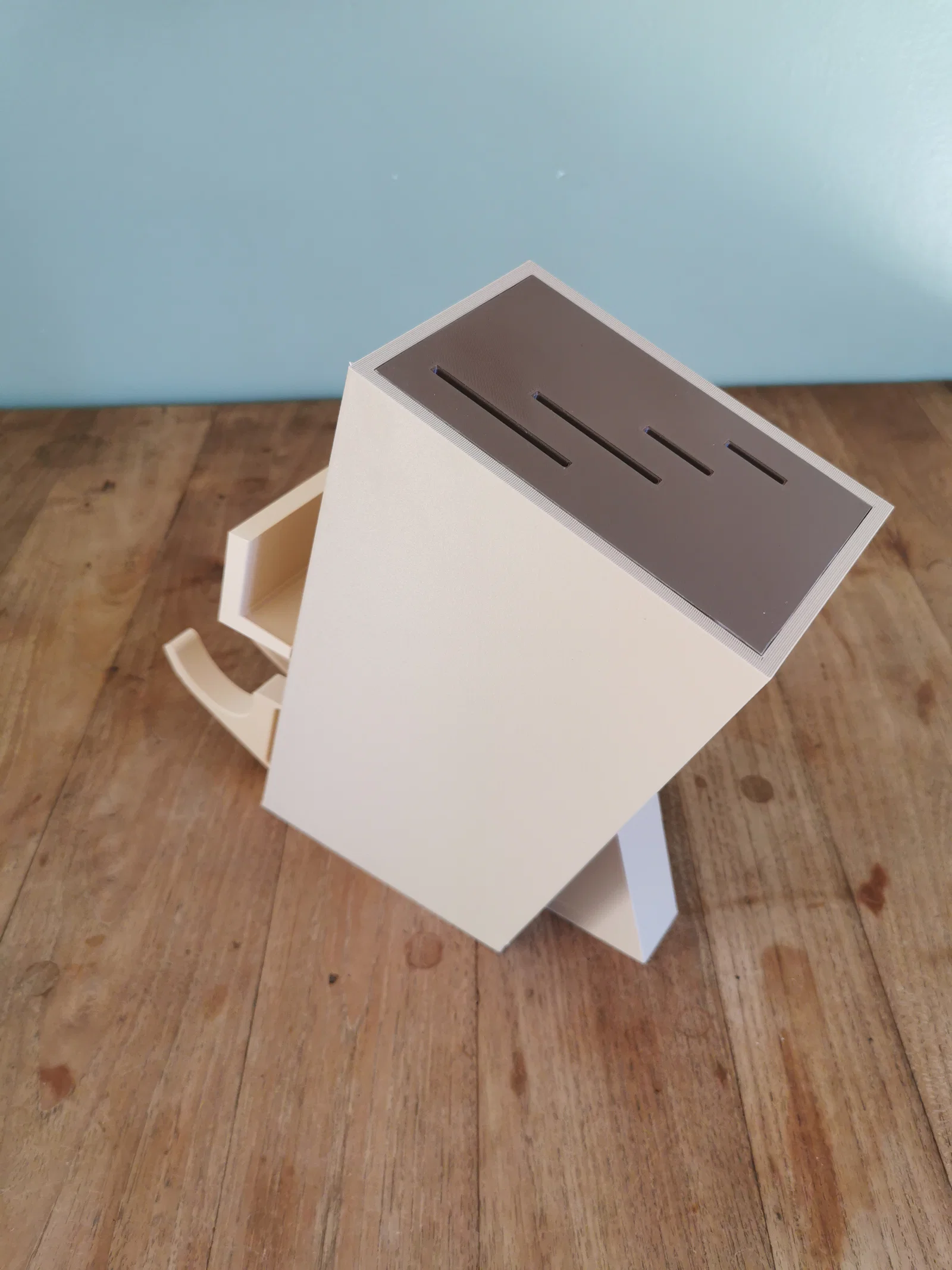 Làm sao để tôn lên vẻ đẹp cho bộ sưu tập dao của bạn với chiếc giá đỡ tuyệt vời này? Bạn có thể đặt dụng cụ mài dao ''DAMAS'' ngay trên giá. Để in giá đỡ này, bạn nên sử dụng thêm một lớp bè (raft) đủ rộng để tránh tình trạng cong vênh (warping). Tất cả các file thiết kế đều được đính kèm để bạn có thể tùy chỉnh theo ý thích. Dòng máy in: COREONE Loại nhựa: PLA Lượng nhựa sử dụng: 541,12g / 181,43m / 436,38cm³ Nhiệt độ bàn in: 60°C Nhiệt độ đầu in: 220°C Đường kính đầu in: 0,4mm Chiều cao lớp in: 0,2mm Độ đặc (infill): 15% Có sử dụng support: Có