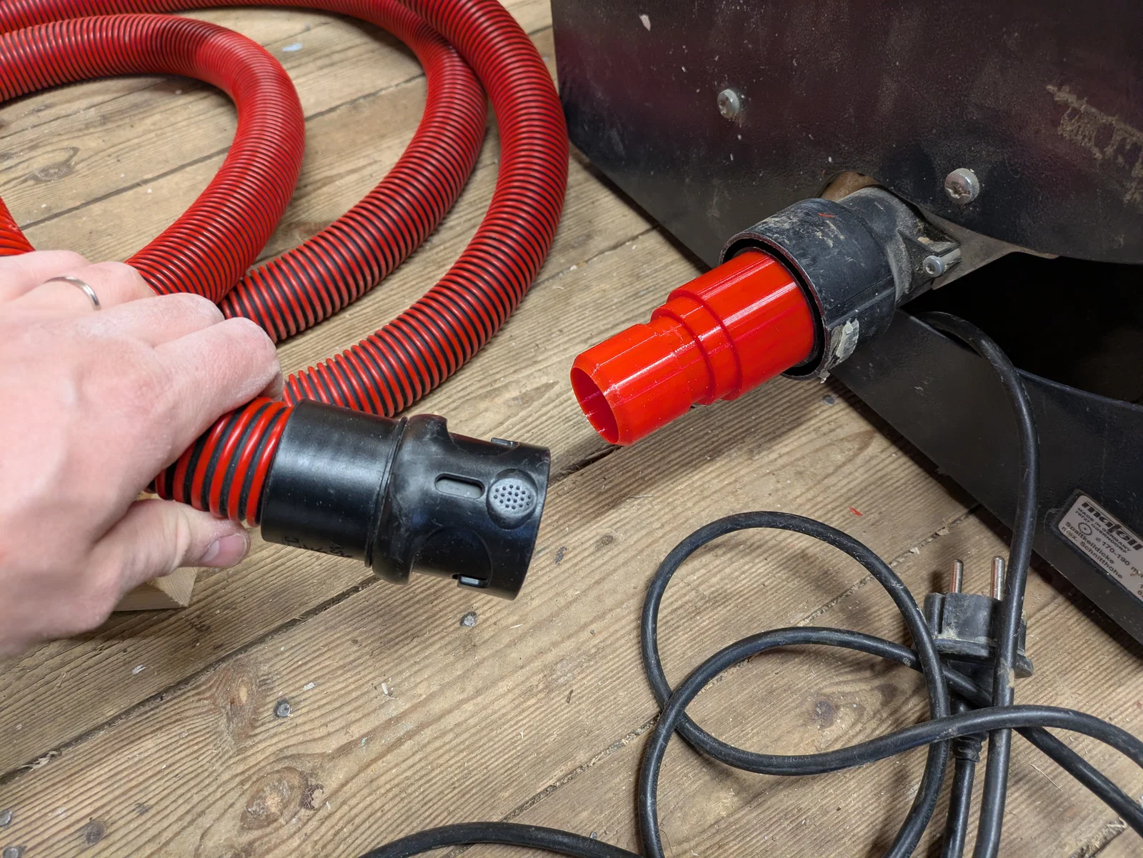 Đây là adapter dùng để gắn máy hút bụi Makita VC4210 vào cổng hút bụi của máy cưa bàn Mafell Erika 60 E, tận dụng đầu kết nối nhanh trên ống hút bụi.