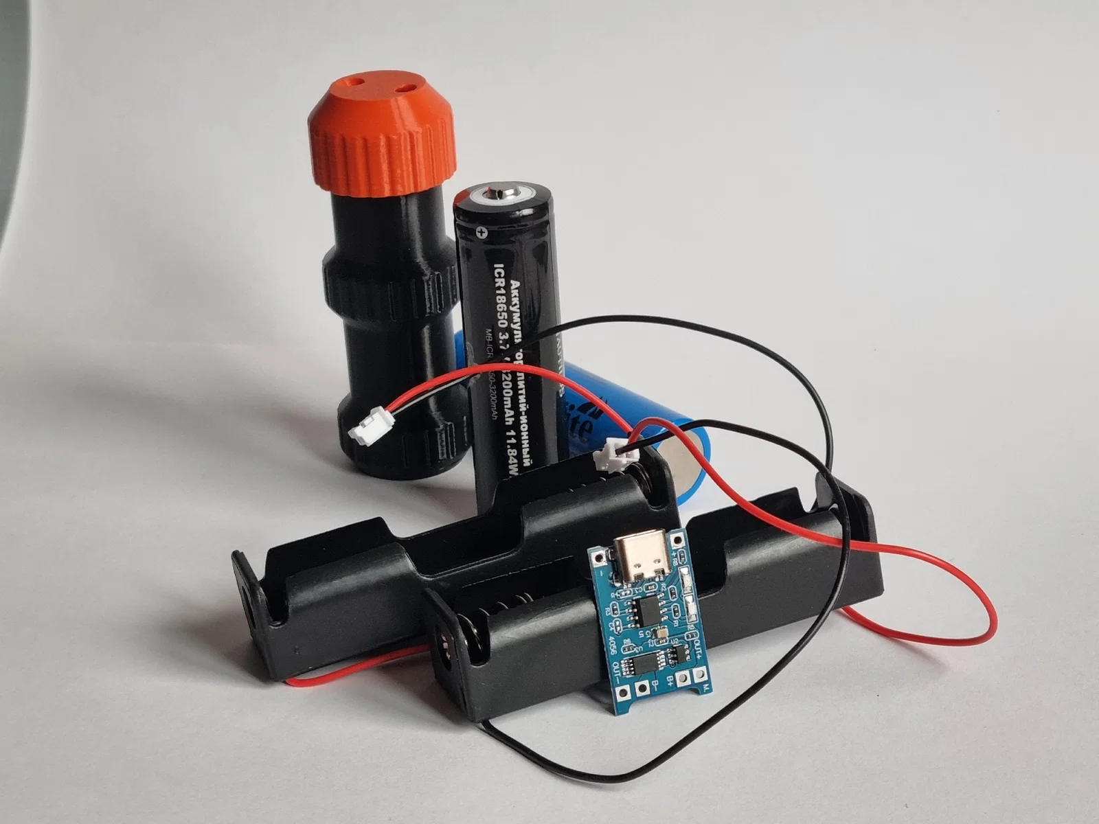 Các linh kiện cần chuẩn bị: TP4056 (1 cái), Hộp đựng pin 18650 (1 cái), Máy in 3D, Nhựa tùy chọn và nhựa trong suốt (hoặc bất kỳ vật liệu trong suốt nào), Dây điện, Ốc M3 (2 cái), vòng đệm/long đền vênh, đai ốc (2 cái), Keo khóa ren, Keo nến, keo 502, Mỏ hàn và thiếc hàn.