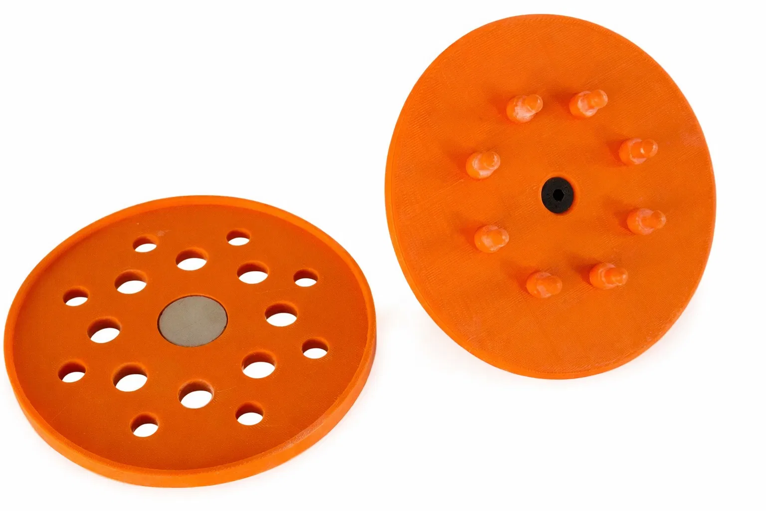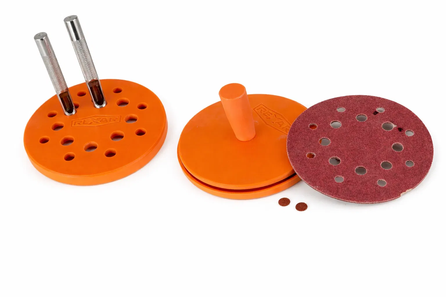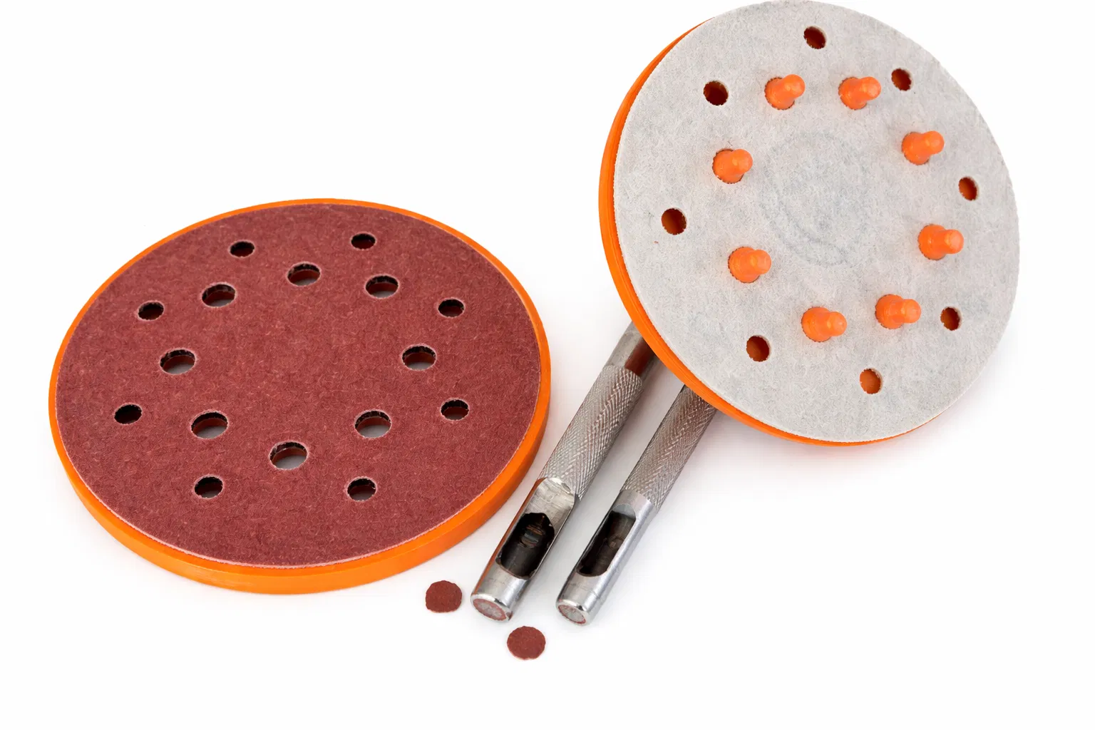 Đây là mẫu (template) dùng để khoét lỗ trên các đĩa nhám giúp tối ưu hóa khả năng thoát bụi. Bộ sản phẩm bao gồm một thiết bị định vị giúp bạn dễ dàng lắp đặt lên đầu máy mài.nnCác phụ kiện cần chuẩn bị:nn- Miếng gai dính (Velcro) loại 125mm có keo dán.n- Nam châm kích thước 25x2.5mm.n- Dụng cụ đục lỗ da (Leather Punch) đường kính 9mm.n- Dụng cụ đục lỗ da (Leather Punch) đường kính 7mm.n- Ốc vít đầu bằng M6 dài 20mm.