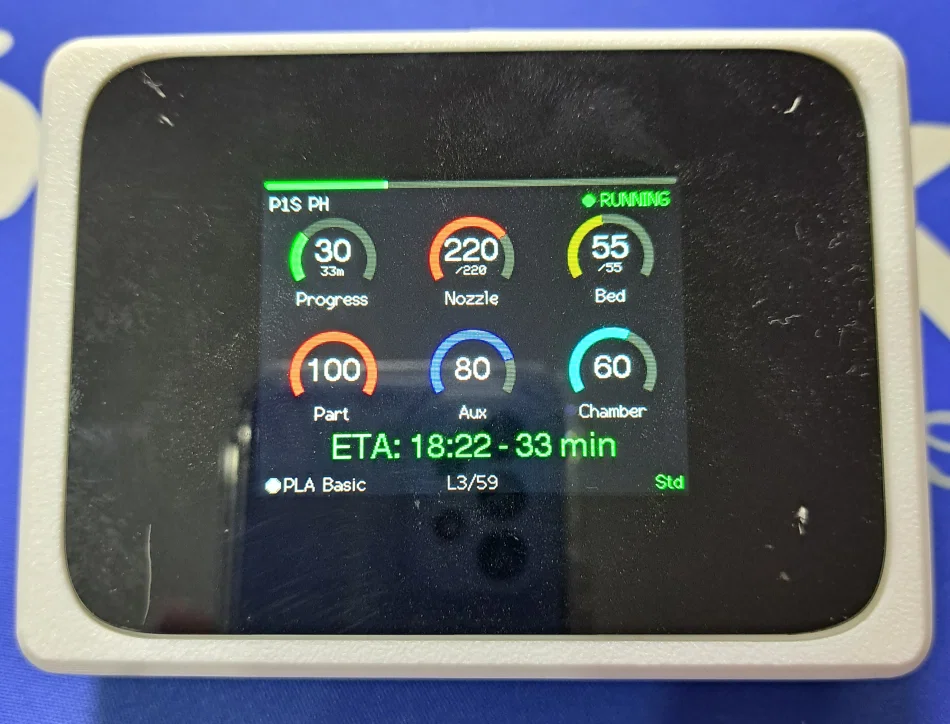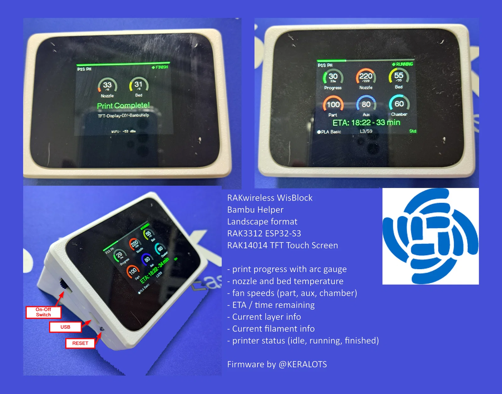 Dự án vỏ máy in 3D dành cho WisBlock RAK14014, giúp bạn giám sát trạng thái in của máy in BambuLab một cách chuyên nghiệp với màn hình TFT hiển thị theo chế độ ngang (landscape) tiện lợi.