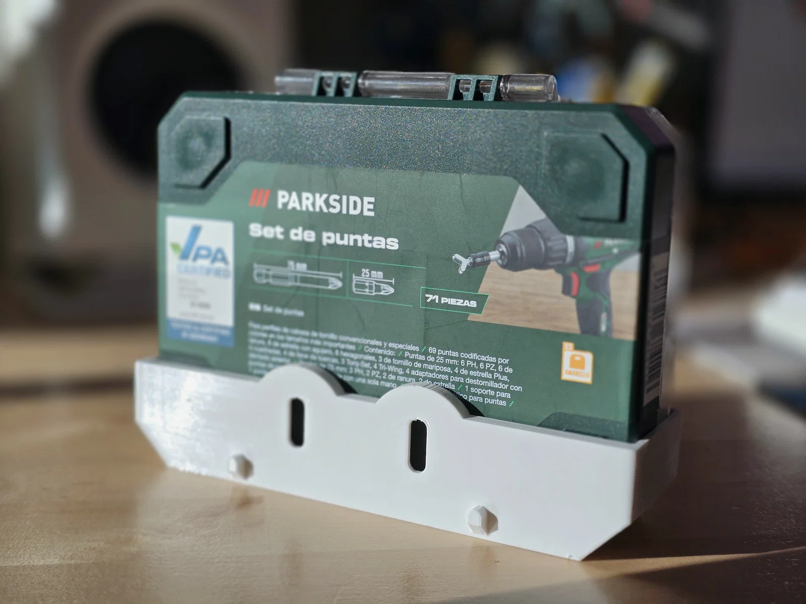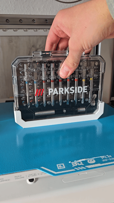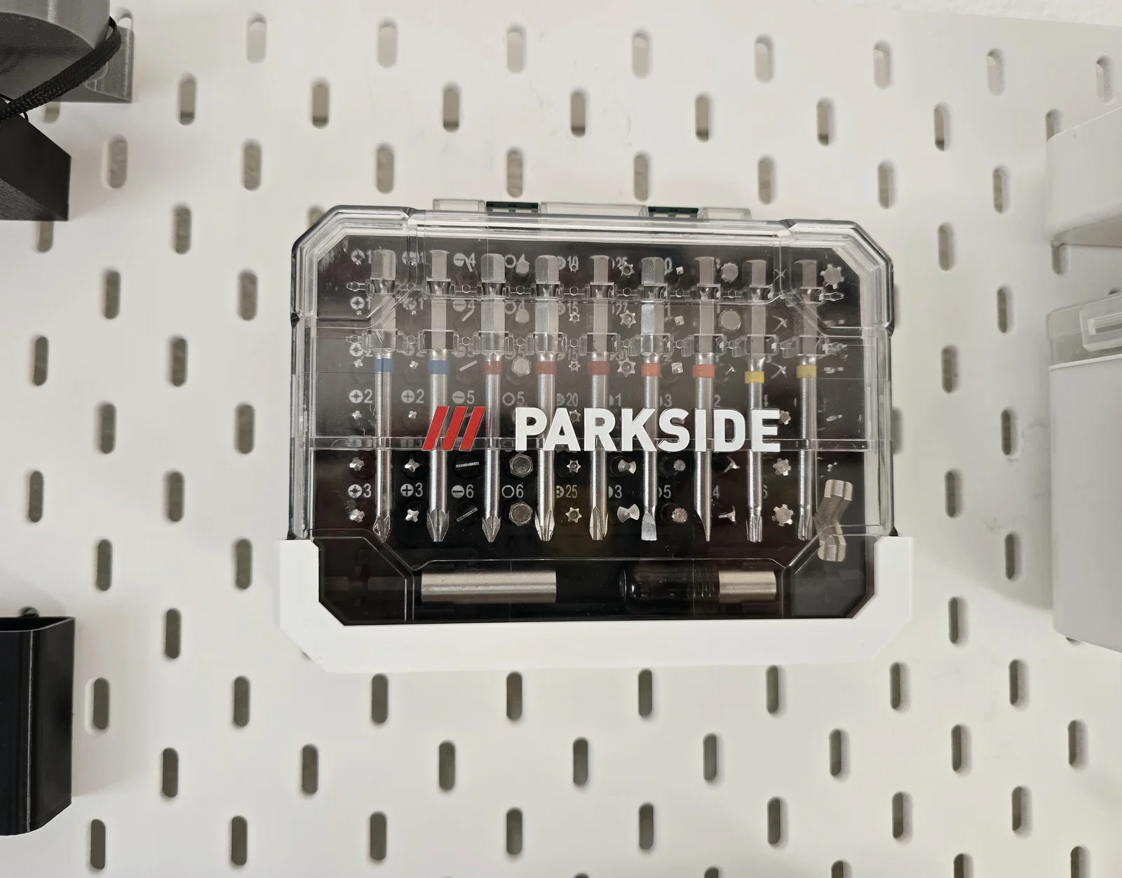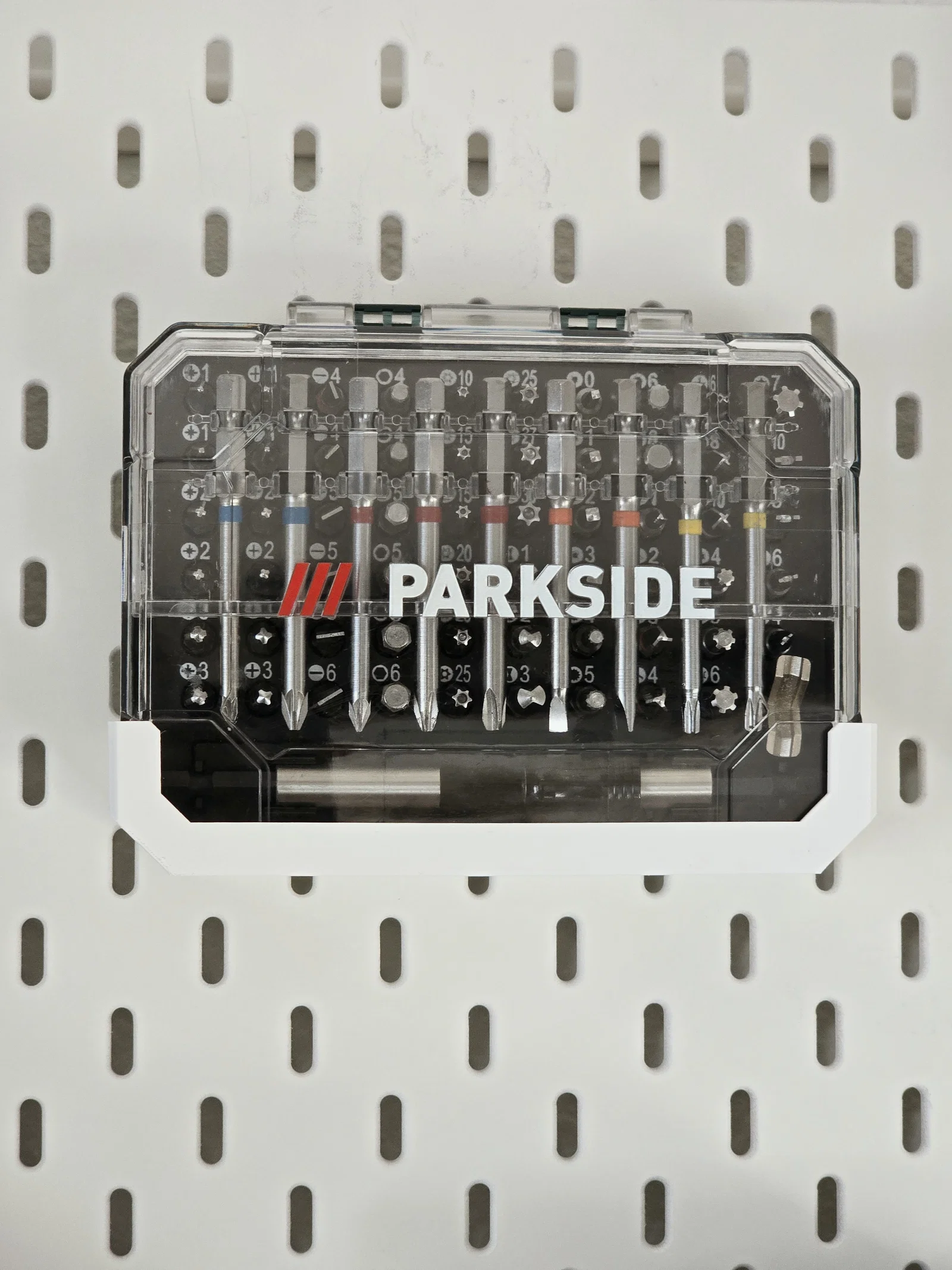 Một mẫu in đơn giản nhưng cực kỳ chắc chắn, in nhanh và không cần support để giữ bộ bit-set Parkside trên bảng Ikea Skadis… :)