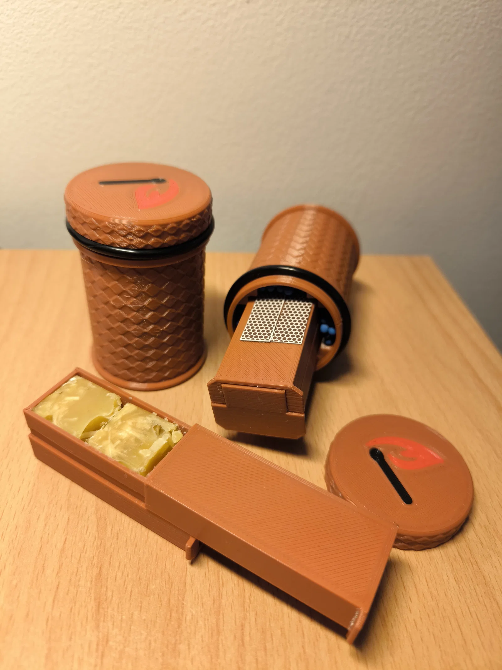 Hộp chống nước nhỏ gọn dành cho những chuyến đi, thiết kế để đựng được 3 viên nhóm lửa (2x2x2 cm) và khoảng 35 que diêm. Hỗ trợ in màu với các icon ngọn lửa và que diêm, đảm bảo độ kín khít khi sử dụng thêm vòng đệm cao su.