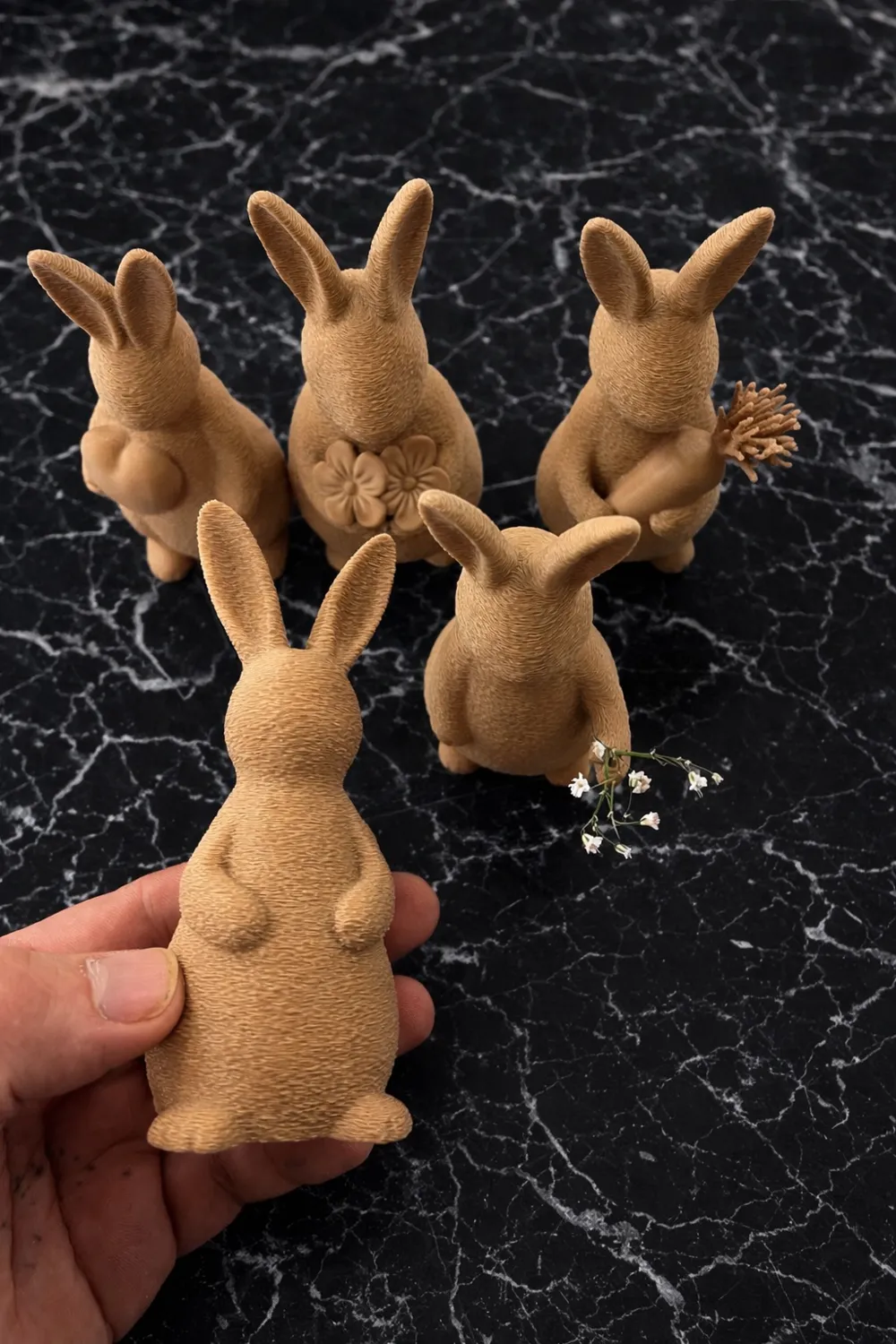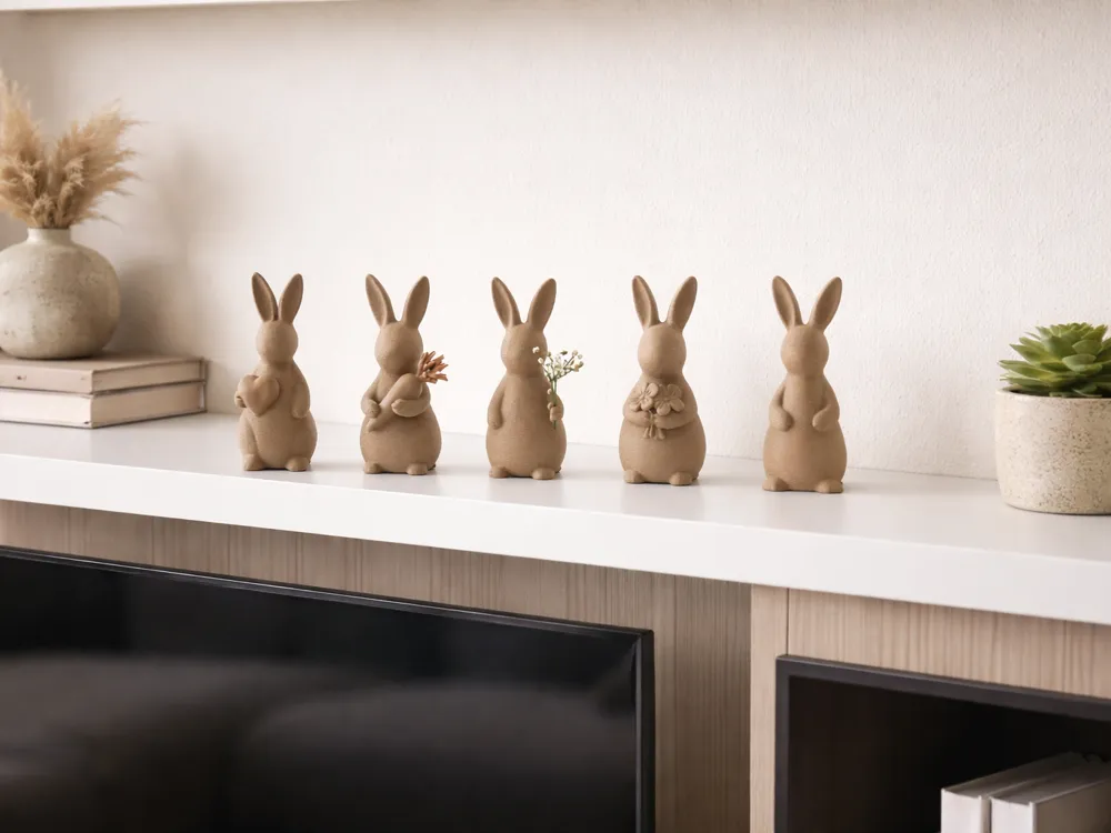Bộ tượng thỏ Phục sinh được in 3D với sự kết hợp độc đáo giữa bề mặt FuzzySkin và bề mặt mịn. Thiết kế rỗng nhẹ nhàng, có lỗ cắm hoa nhỏ, tạo điểm nhấn trang trí tinh tế và đầy phong cách cho không gian nội thất của bạn trong dịp lễ.