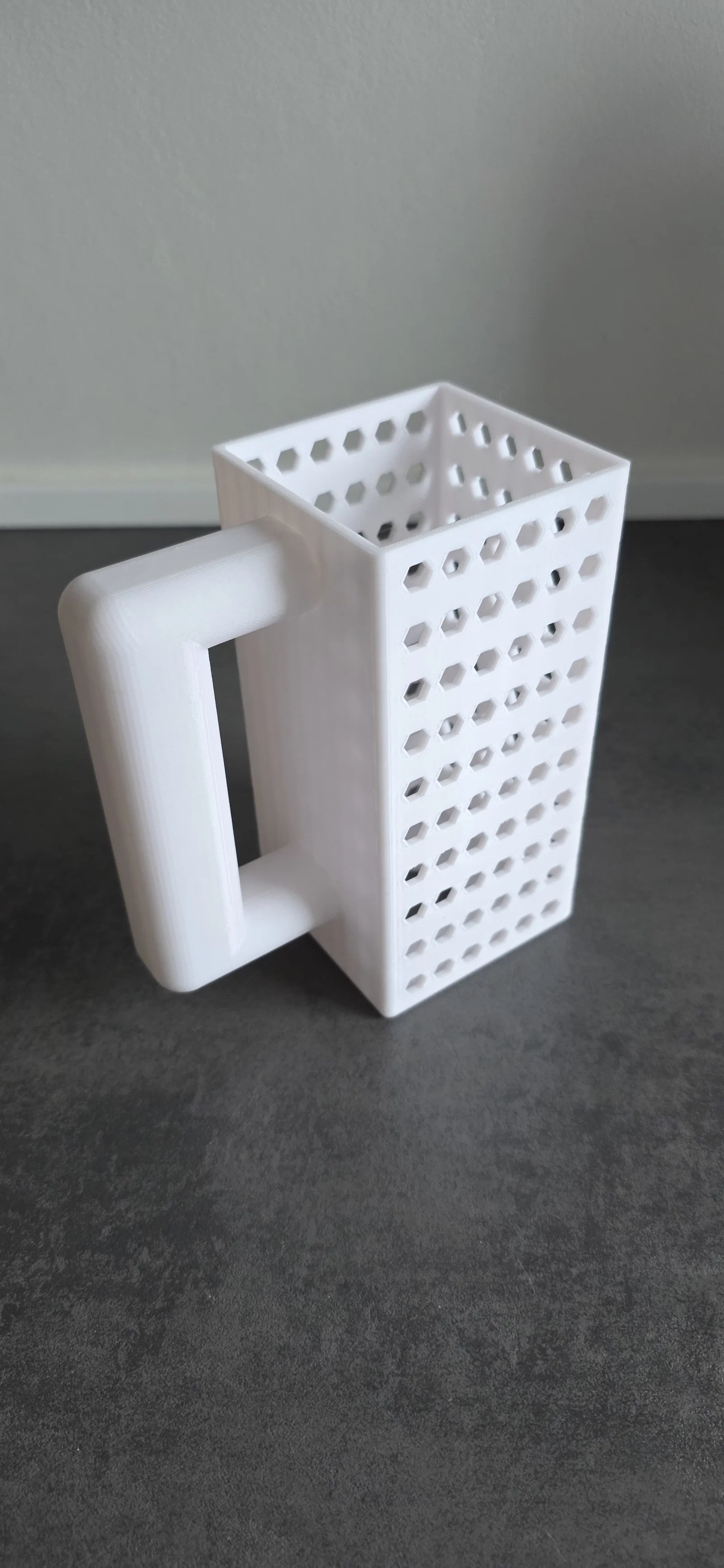 • Tiết kiệm vật liệu: Thiết kế các đường cắt lục giác bắt mắt giúp tiết kiệm filament in và trông rất đẹp trên kệ bếp của bạn.