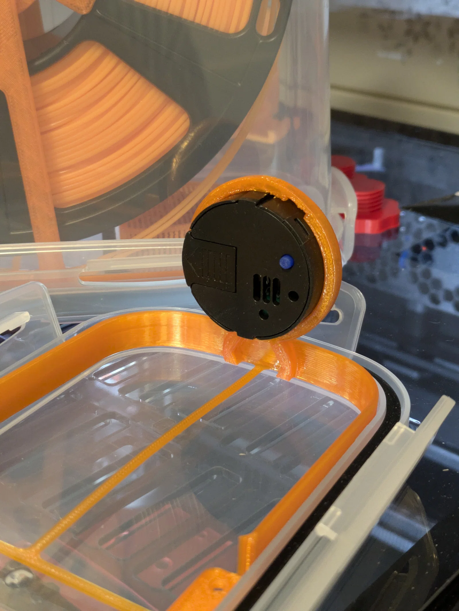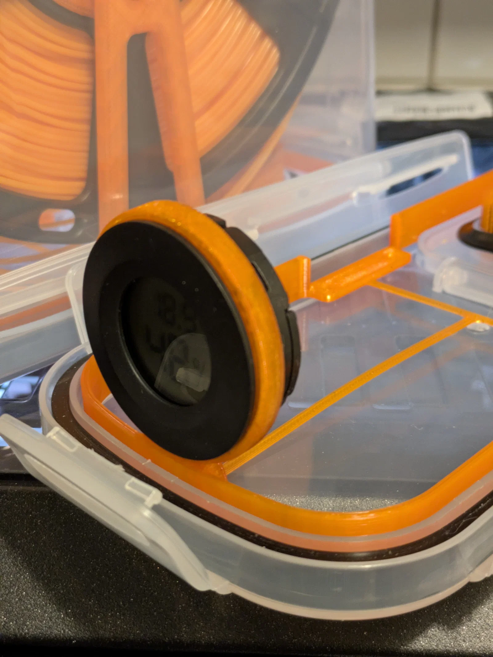 Mình đã mua mấy cái hộp đựng ngũ cốc Kichly và dùng các mẫu của @Tenoctcatl để biến chúng thành hộp chống ẩm (drybox). Tuy nhiên, mình thấy thiếu chỗ gắn ẩm kế, nên mình đã thêm phần giá đỡ từ mẫu của @Pekno vào đây.