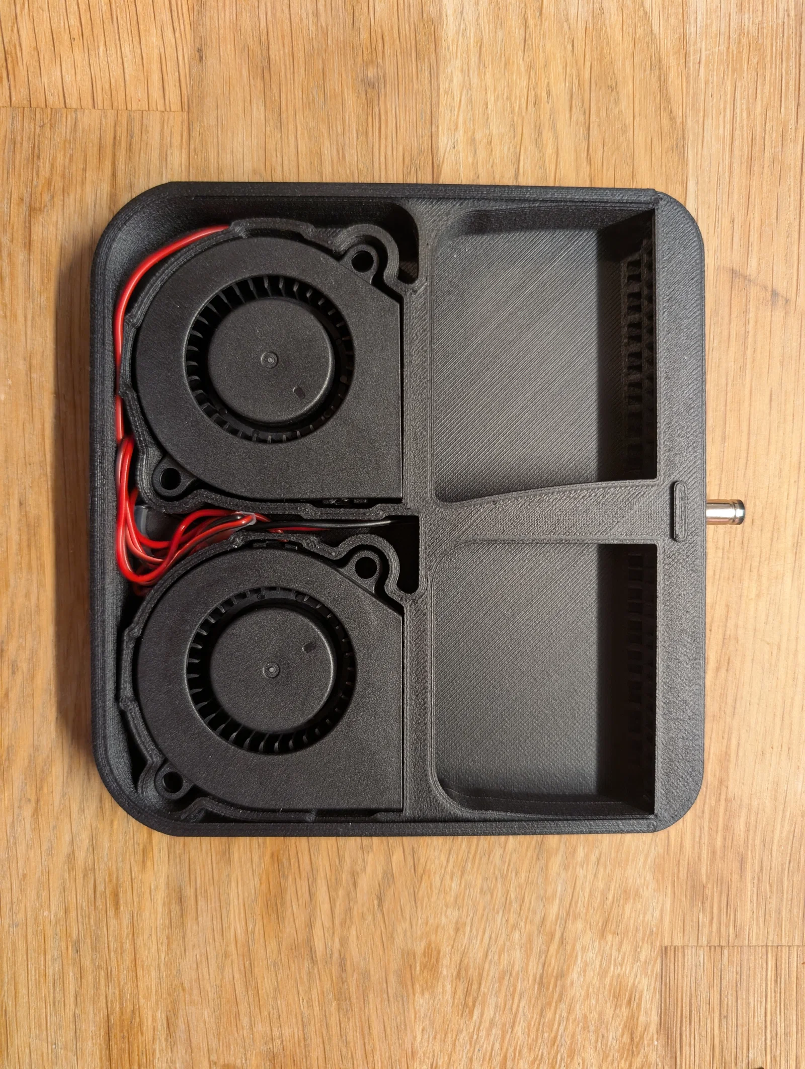 Chuyện là mình mới mua quạt tản nhiệt cho bàn in mà không kiểm tra kỹ thông tin. Mình vô tình mua phải loại quạt 5015 GDSTIME "đời mới" với tốc độ 8500rpm. Loại này có miệng thổi gió to hơn, làm nó không tương thích với các phiên bản "The Filter" hiện có. Trên trang bán hàng, họ ghi là "24V Ball 8500RPM New". Vì mình đã quen dùng bản DC jack mod và rất ưng ý, nên mình đã thiết kế lại một bản mod để khớp với loại quạt này: