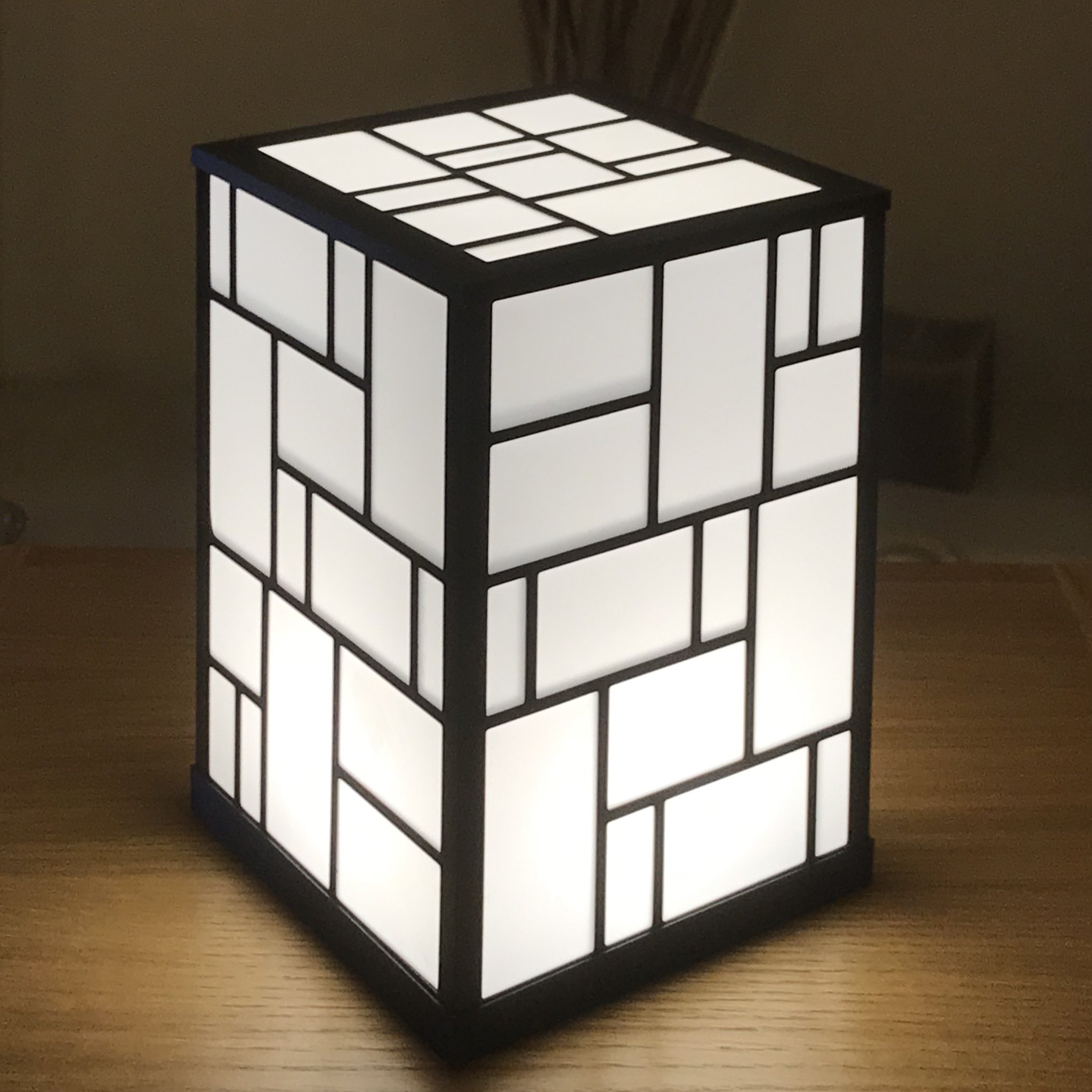 Một chiếc đèn bàn nhiều màu sắc lấy cảm hứng từ họa sĩ người Hà Lan Piet Mondrian mà bạn có thể dễ dàng in mà không cần máy in đa vật liệu, cao 180mm và vuông 122mm.