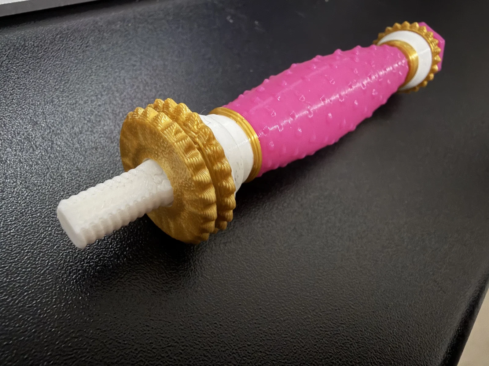 Bản remix cây đũa phép Narcissa của Shmoee với thiết kế khớp nối vặn ren. Phần ren được cắt phẳng hai bên để có thể in nằm ngang, giúp tăng cường độ cứng cáp cho đũa.