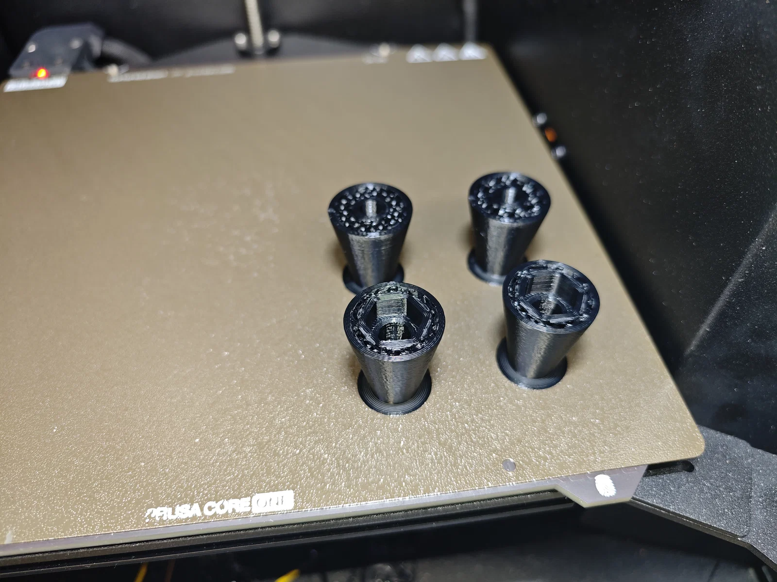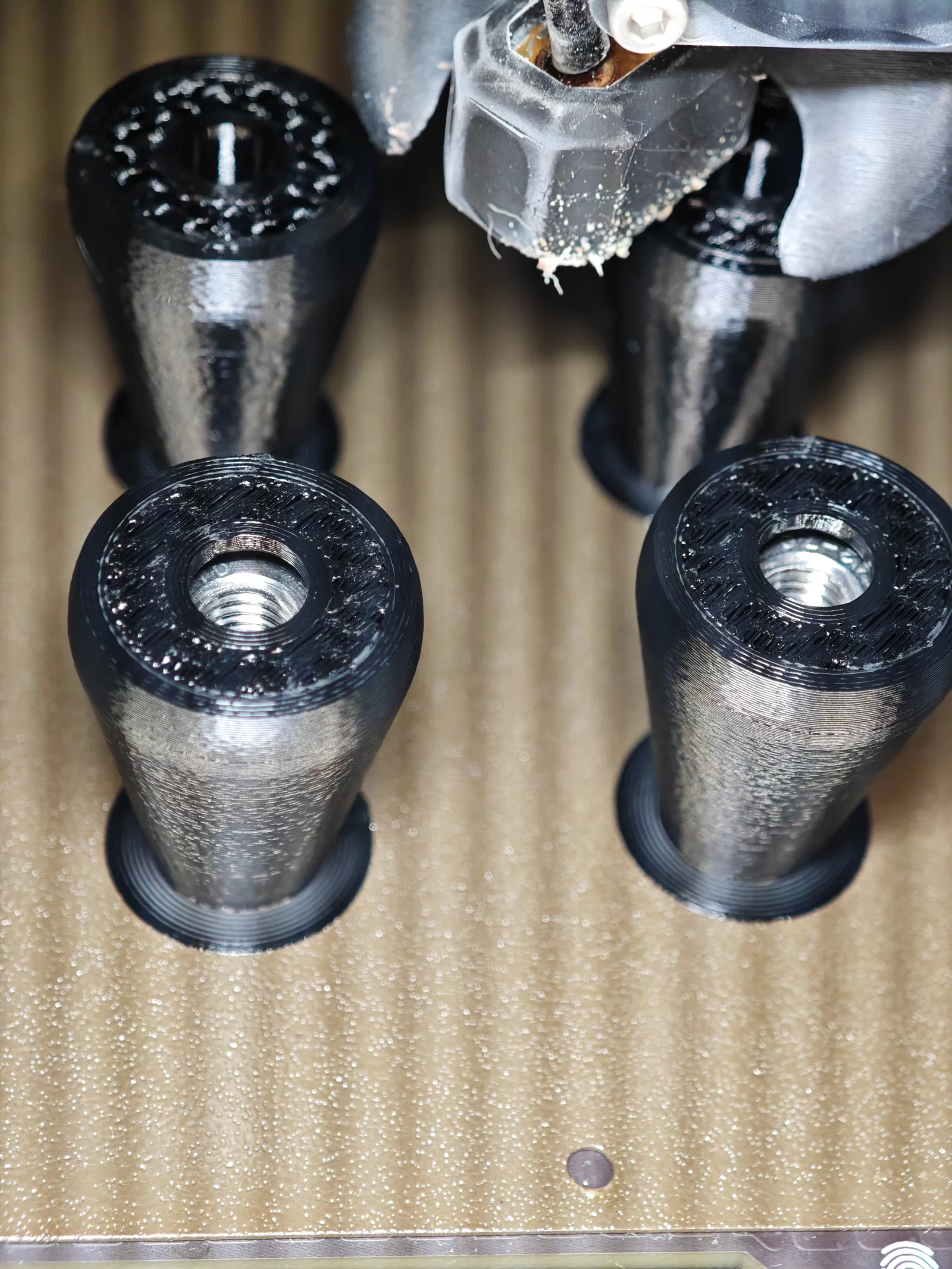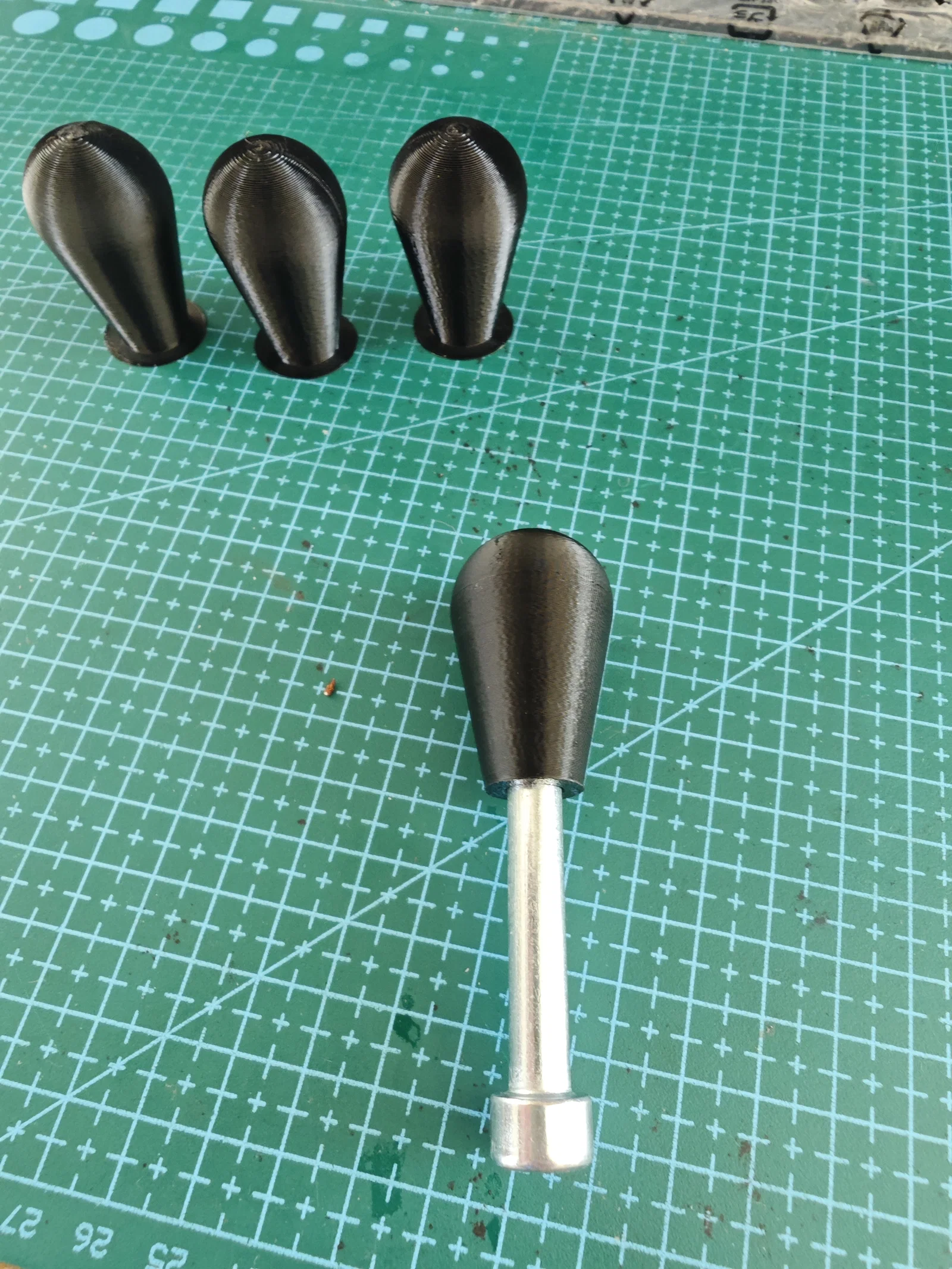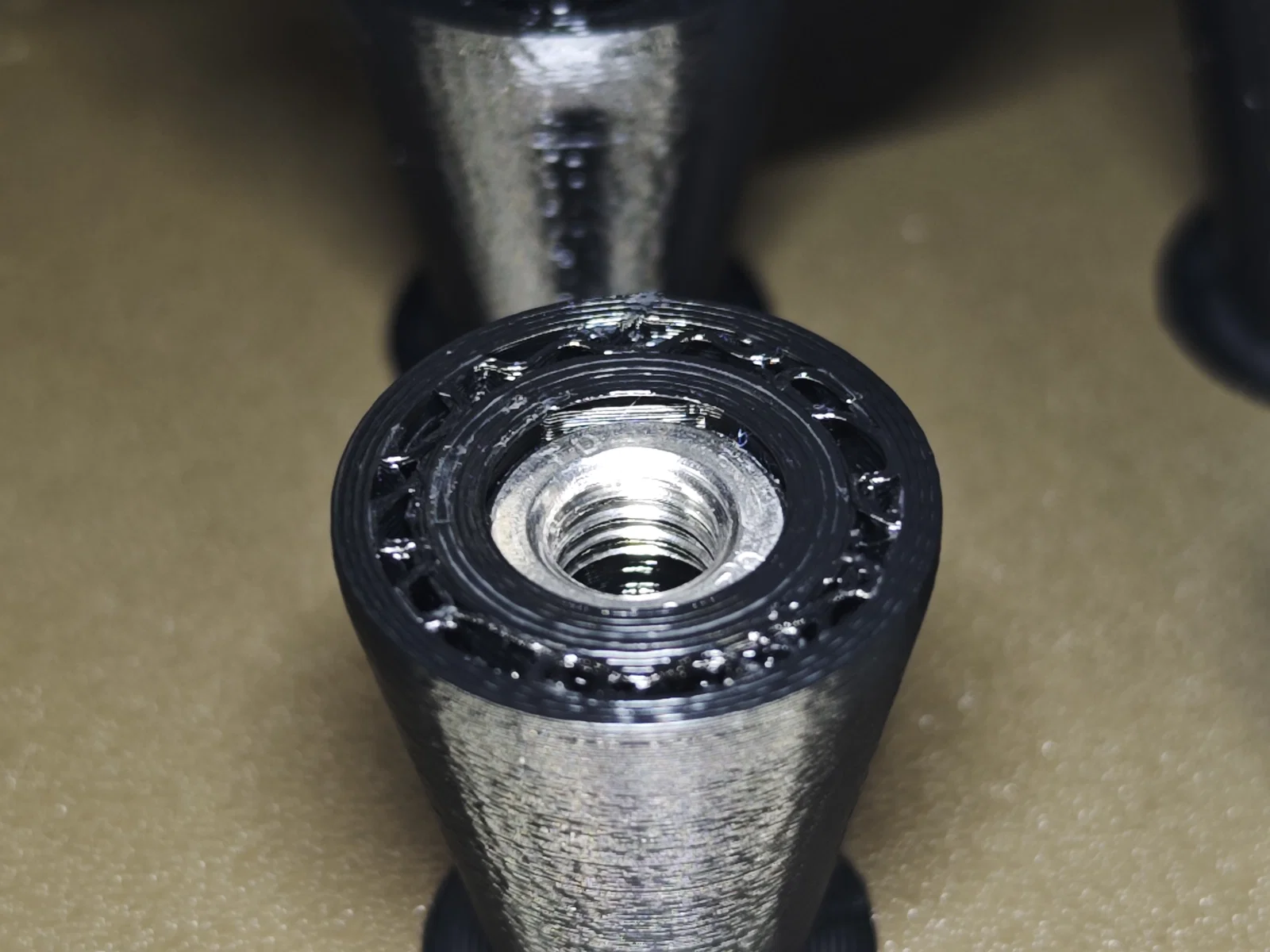 Mẫu tay cầm này có hai phiên bản: phiên bản thứ nhất dùng cho mũi taro, phiên bản thứ hai dùng cho đai ốc M8.nnPhiên bản một có lỗ 6.5mm để tạo ren M8 bằng mũi taro, chiều dài ren 34mm.nnPhiên bản hai được thiết kế với hốc lục giác sâu 22mm vừa vặn với đai ốc M8. Bạn nhớ thiết lập lệnh tạm dừng (pause) trên máy in trước khi máy đóng lớp bề mặt phía trên hốc để chèn đai ốc vào thủ công nhé. Tôi khuyên dùng đai ốc bằng thép không gỉ (stainless steel) để tránh bị gỉ sét.nnVật liệu và thiết lập in:nnTôi sử dụng nhựa PCTG. Thiết lập 5 vách (perimeters) cho bản dùng mũi taro và 4 vách cho bản dùng đai ốc. Độ lấp đầy (infill) 20% dạng gyroid, có dùng brim, 5 lớp đáy và 5 lớp trên. Cập nhật: PCTG rất phù hợp khi in trên tấm PEI trơn, không cần brim và rất dễ tháo.nnCập nhật: Đã thêm phiên bản dùng đai ốc khóa Nylon (Nylon locking nut) để tay cầm có thể xoay tự do.